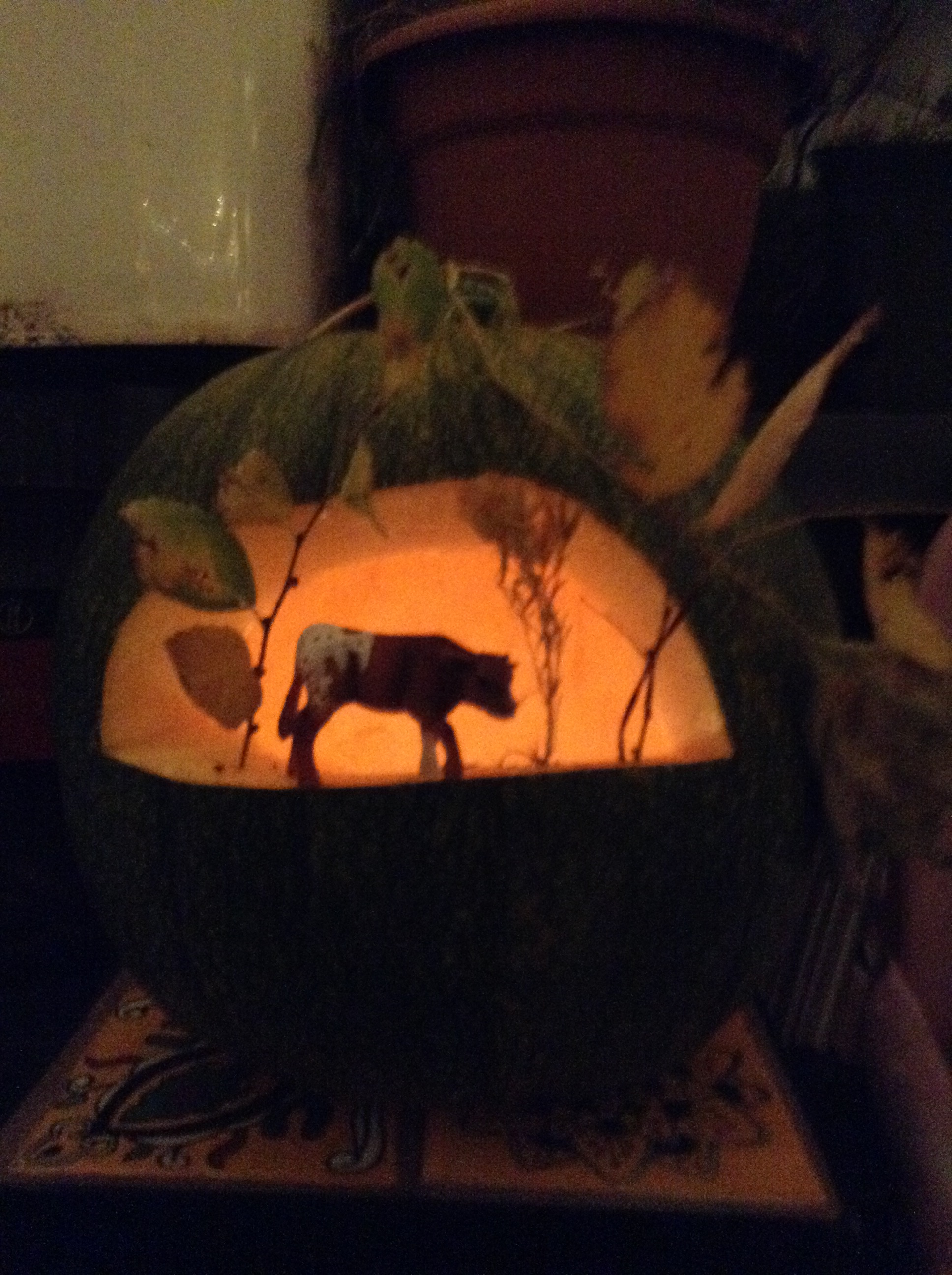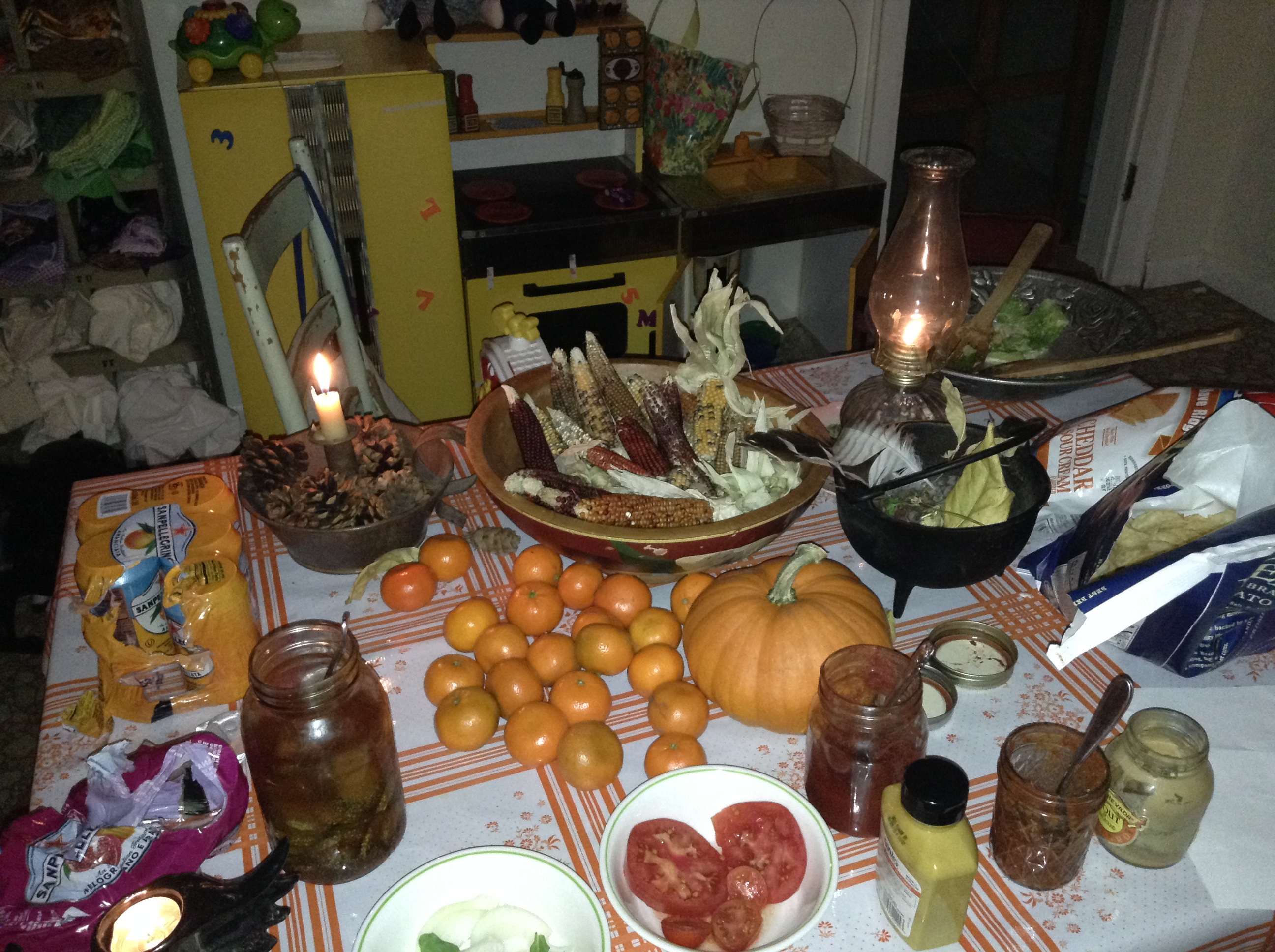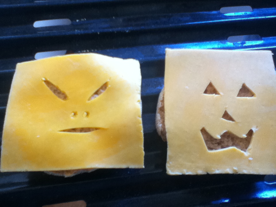 We served a simple meal of Jack O’Lantern hamburgers and veggie burgers (click for recipe), chips, pickles, and salad. Cookies and homemade eggnog for dessert. I was able to enjoy our festivities since everything came together so quickly.