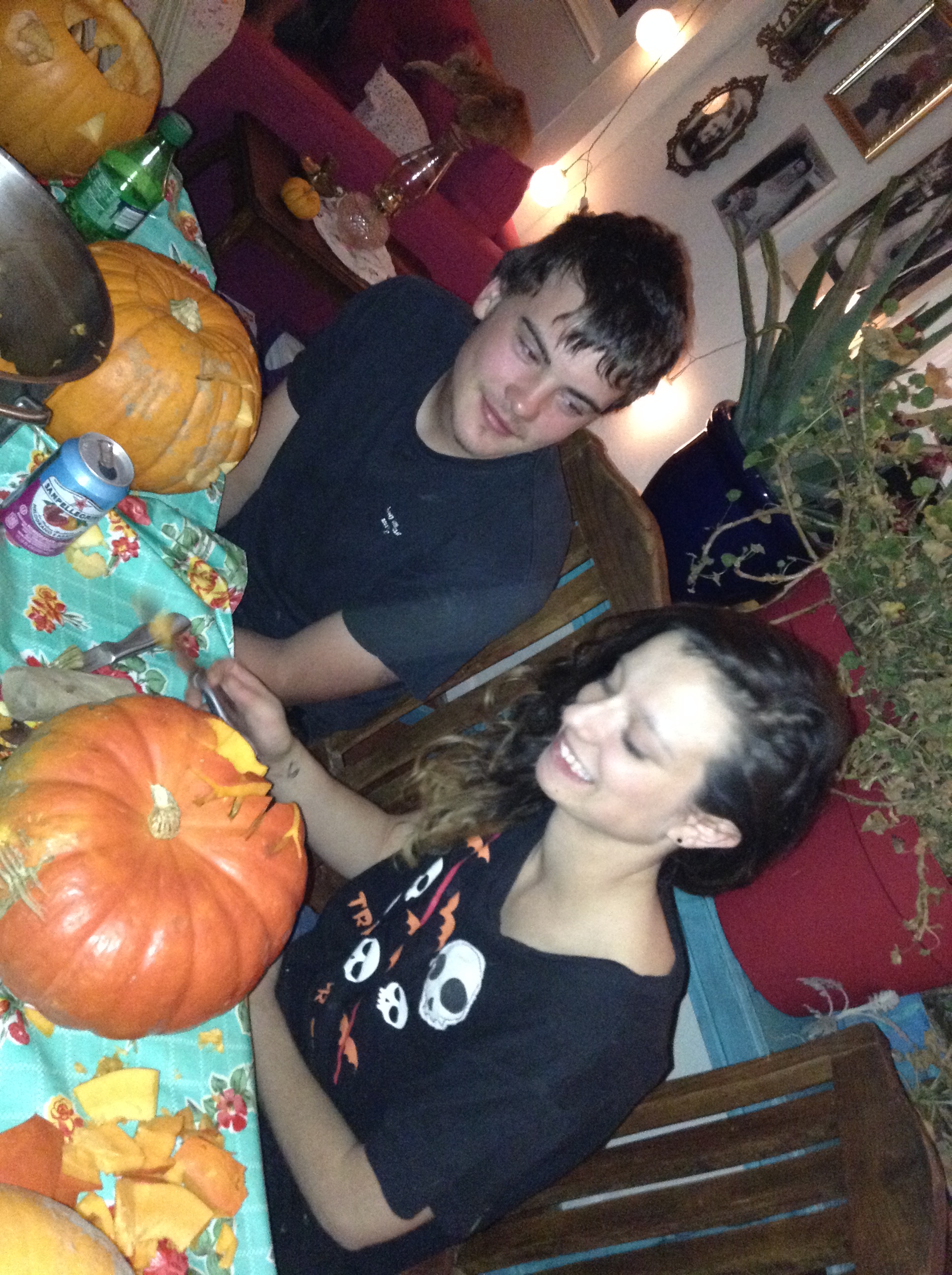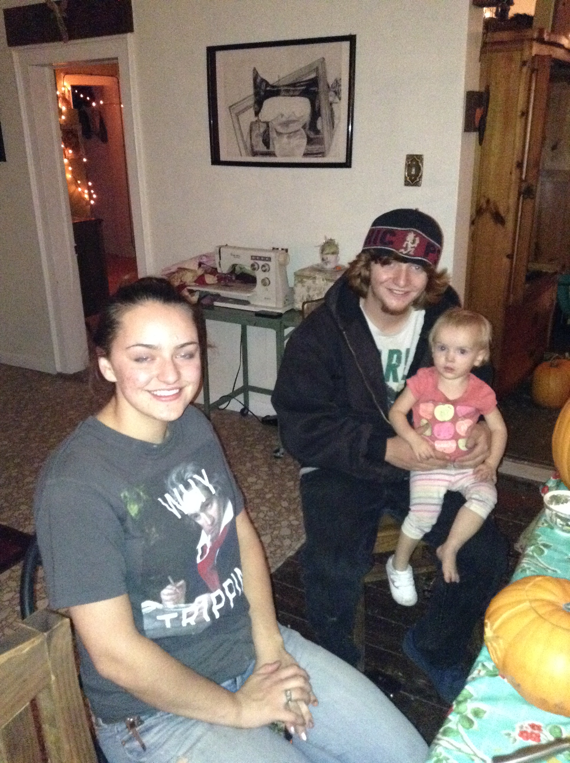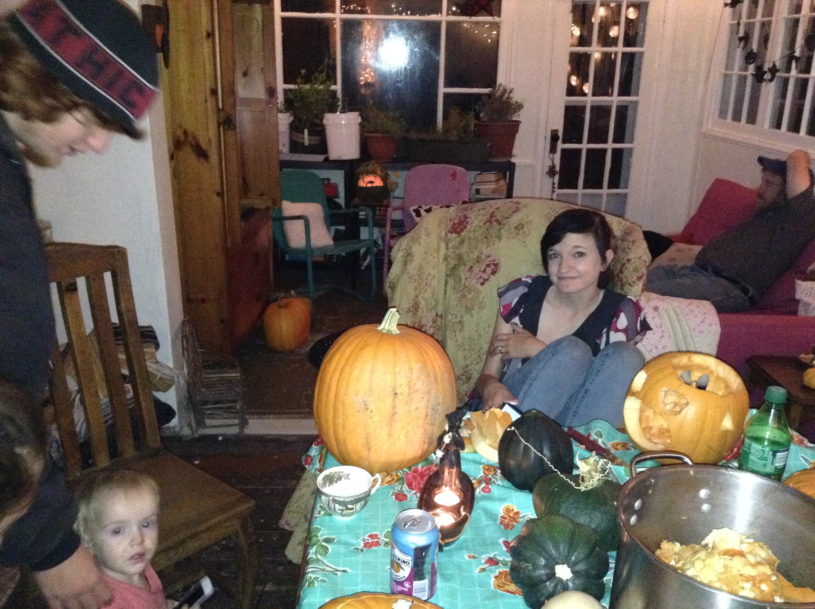 We brought over all of the pumpkins from our garden (leaving a few for the resident buck) when we moved so our house is positively overflowing with a bountiful crop. First dibs went to the kids that could venture out to our new house. Andy and Megan had to work but Shyanne and Dillon, Emily, Bret, and Bret’s sister Becky drove over the river and through the woods to Grammie and Papa’s new homestead to take part in a pumpkin party reminiscent of their childhood. We were babysitting Maryjane so she was already there to help me greet her parents, aunts, and Shyanne’s boyfriend.