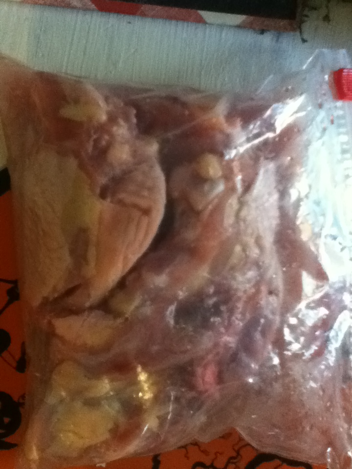 In a zip lock bag (I just used the one the thighs were defrosting in) pour a real good splash of margarita mix and tequila over two good sized pieces of chicken.  We get hungry over here.