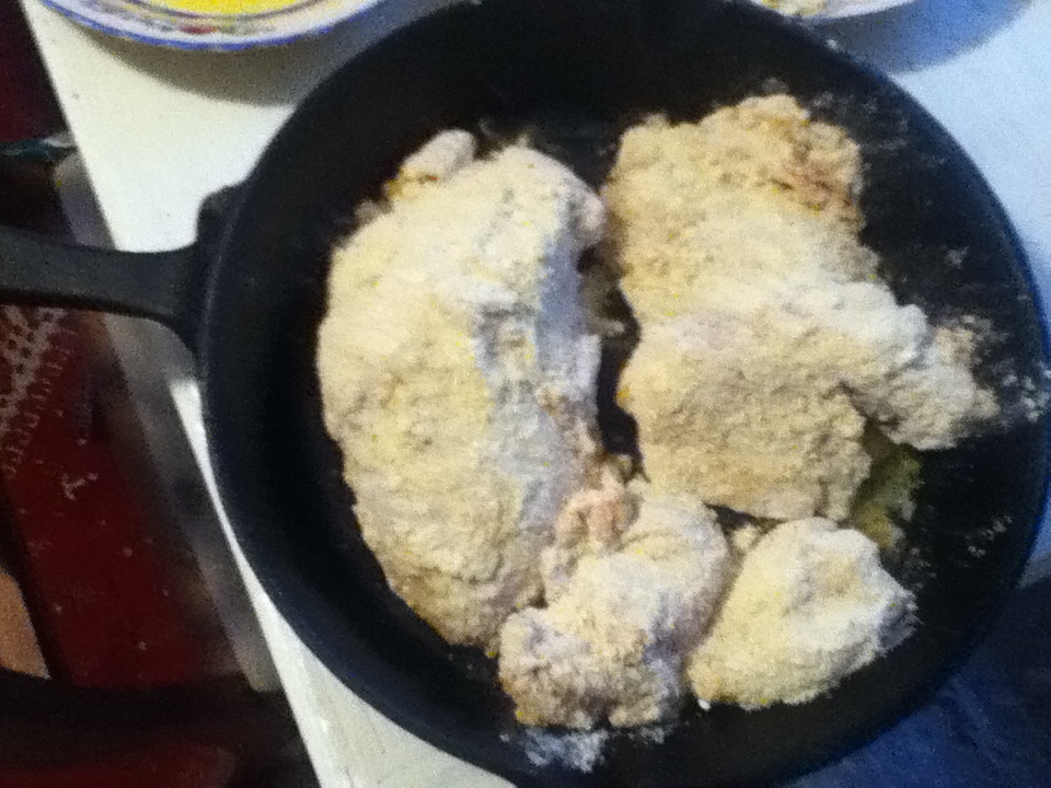 In the third bowl combine 1/2 cup flour, 1/2 cup of cornmeal, 2 teaspoons of taco seasoning, 1 teaspoons of lime salt (or regular sea salt), 1/2 teaspoon of lemon pepper.  Chicken makes its last stop in this bowl.  Completely cover with flour/seasoning mixture and place pieces in a cast iron pan or baking dish.