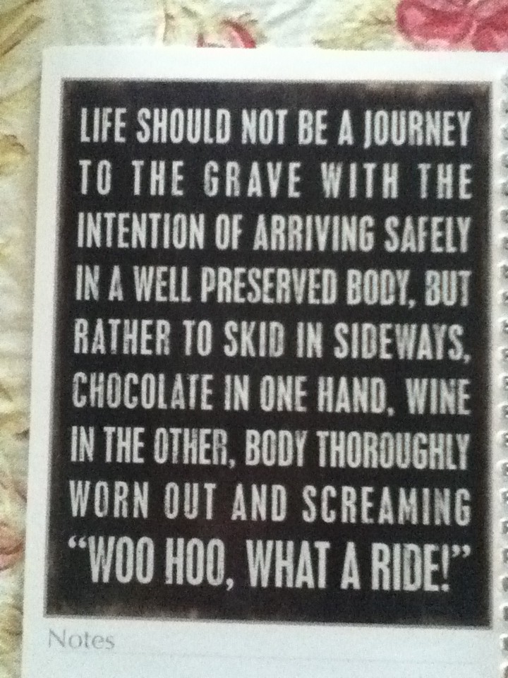 We might be really busy, but we are doing what we want, and having a grand time of it.  My uncle passed away yesterday and he led an interesting and fun life, always teasing, always had a glint of mischief in his eye.  May we live our lives to the fullest.  I love this saying below.  It encourages me to live, play, rest, and work hard…and indulge a bit.  Life is short!