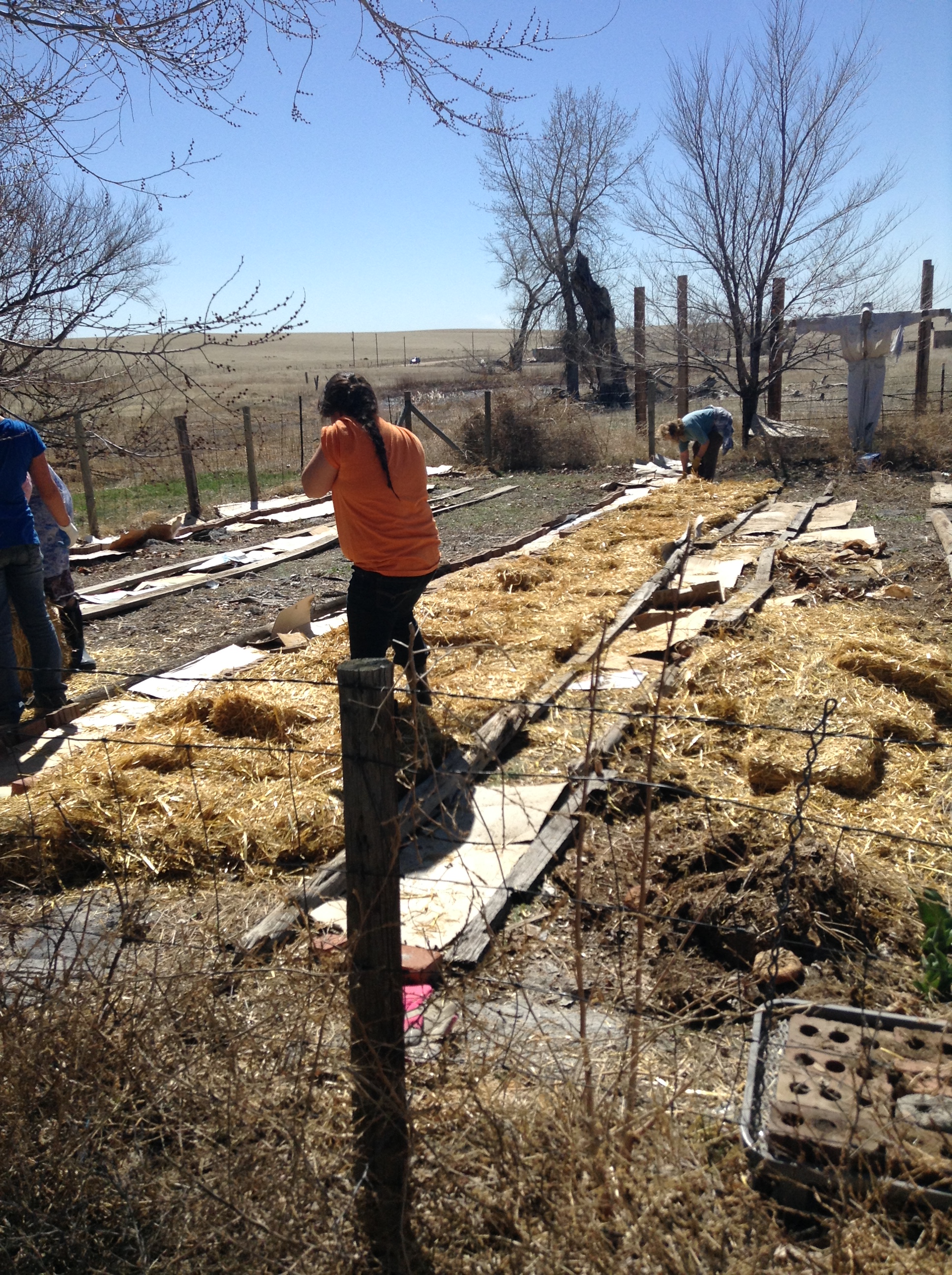 We gathered all the cardboard boxes that I had thrown in there over the winter, flattened them, and laid them beneath the paths. I explained how we would make a one foot path, then a four foot bed, and repeat that all the way across. They didn’t have to be straight beds. Gardening is art, I told them, so they could make the beds wavy like little rivers, or use interesting items to line the path.