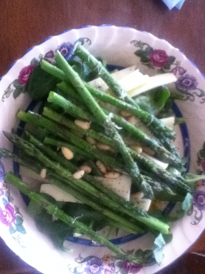 Top with asparagus and pine nuts. And there you go, a simple and scrumptious lunch!