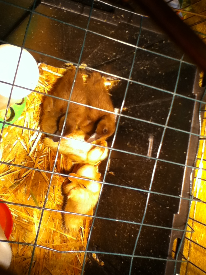 The ducks are two weeks old. They are growing quickly but are still adorable. They look a bit awkward with their feathers starting to come in; like some strange skin disease is starting to take over. I love how they don’t look straight up; they tilt their head and look up at me with one eye. As if they are trying to figure something out or they are highly suspicious of me.