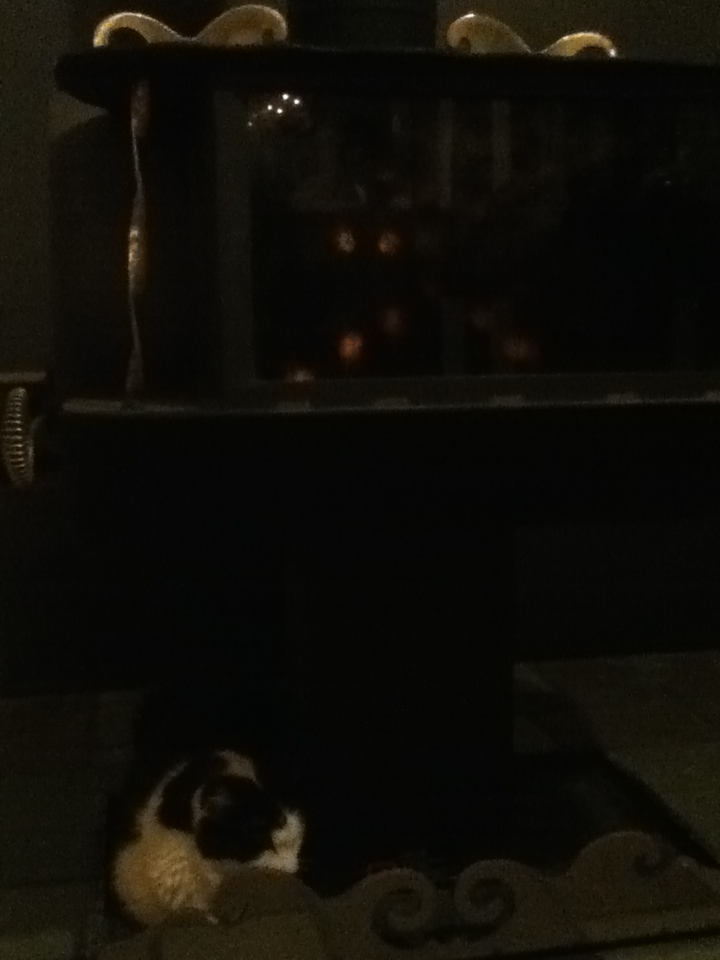 The new wood stove was fired up last night to test it and Ichabod found the warmest spot possible.