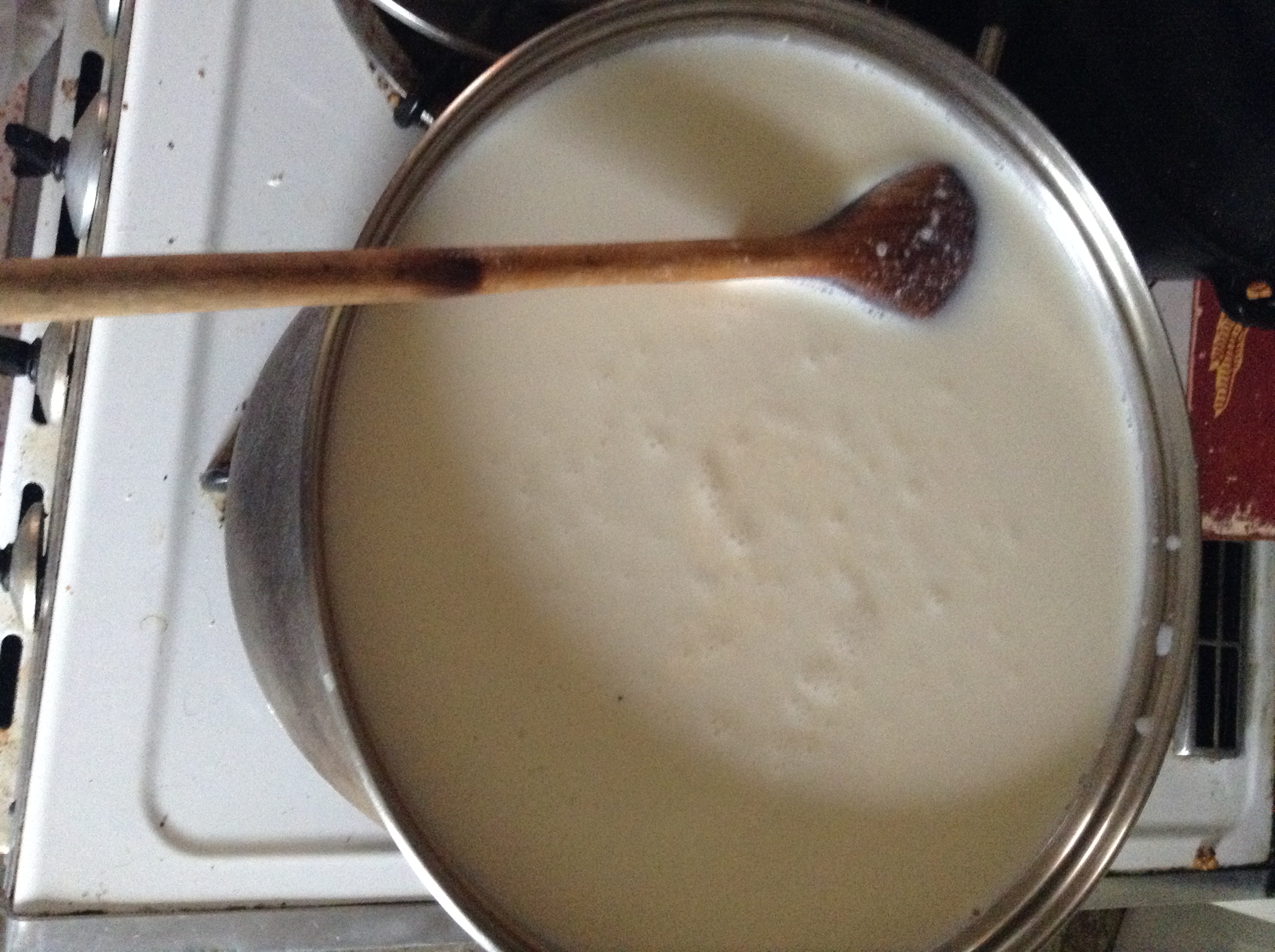 Pour 16 cups of milk (2 gallons of cow’s, goat’s, raw, or store-bought) into a large pot and bring temperature to 90 degrees over medium heat, stirring often.