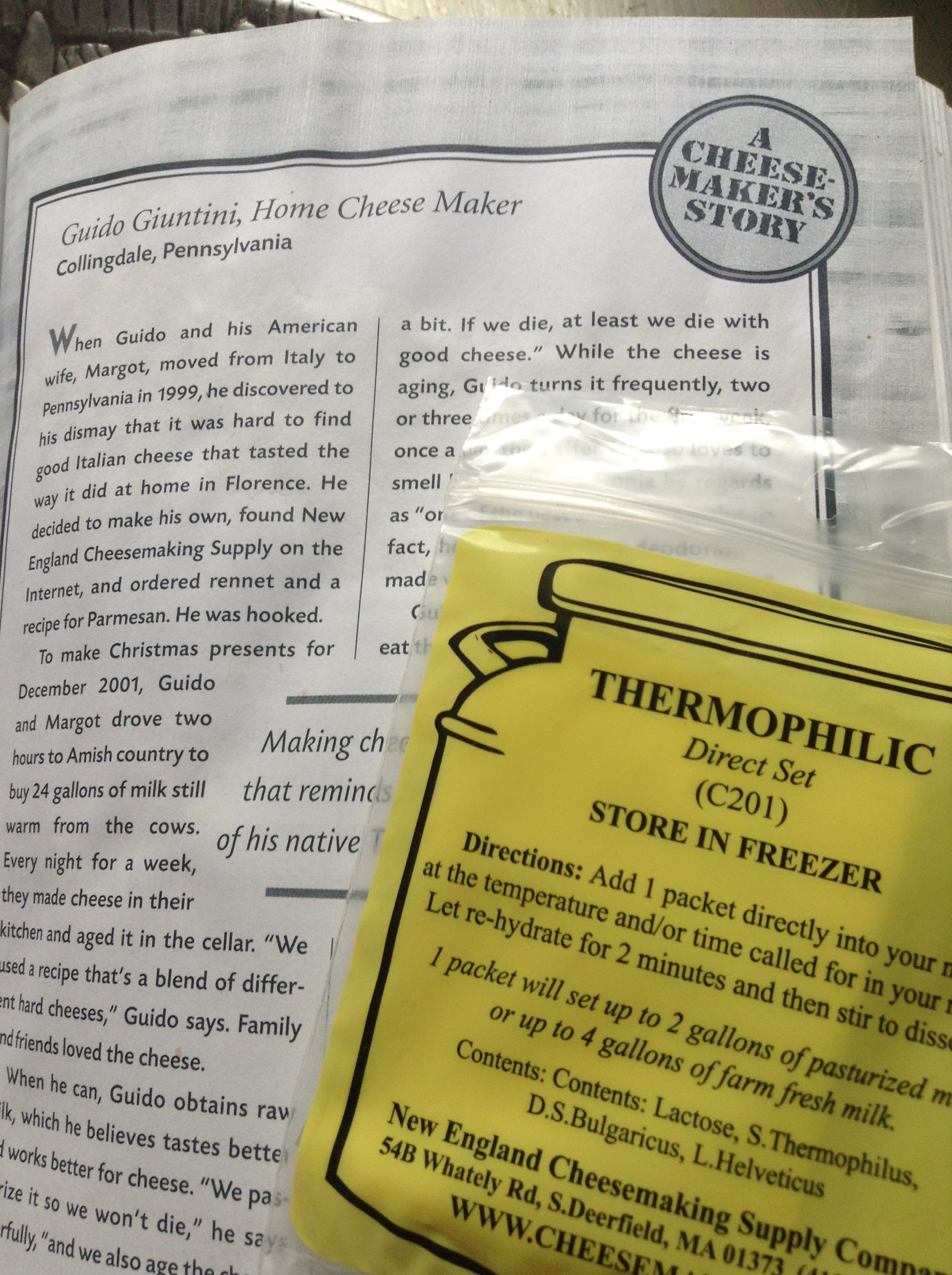 Add one package of Thermophilic starter (I get mine from Buckley’s Homestead Supply in Colorado Springs or Dry Dock Brewing in Aurora or you can order online.) and stir well. Put lid on and let sit for 25-30 minutes.