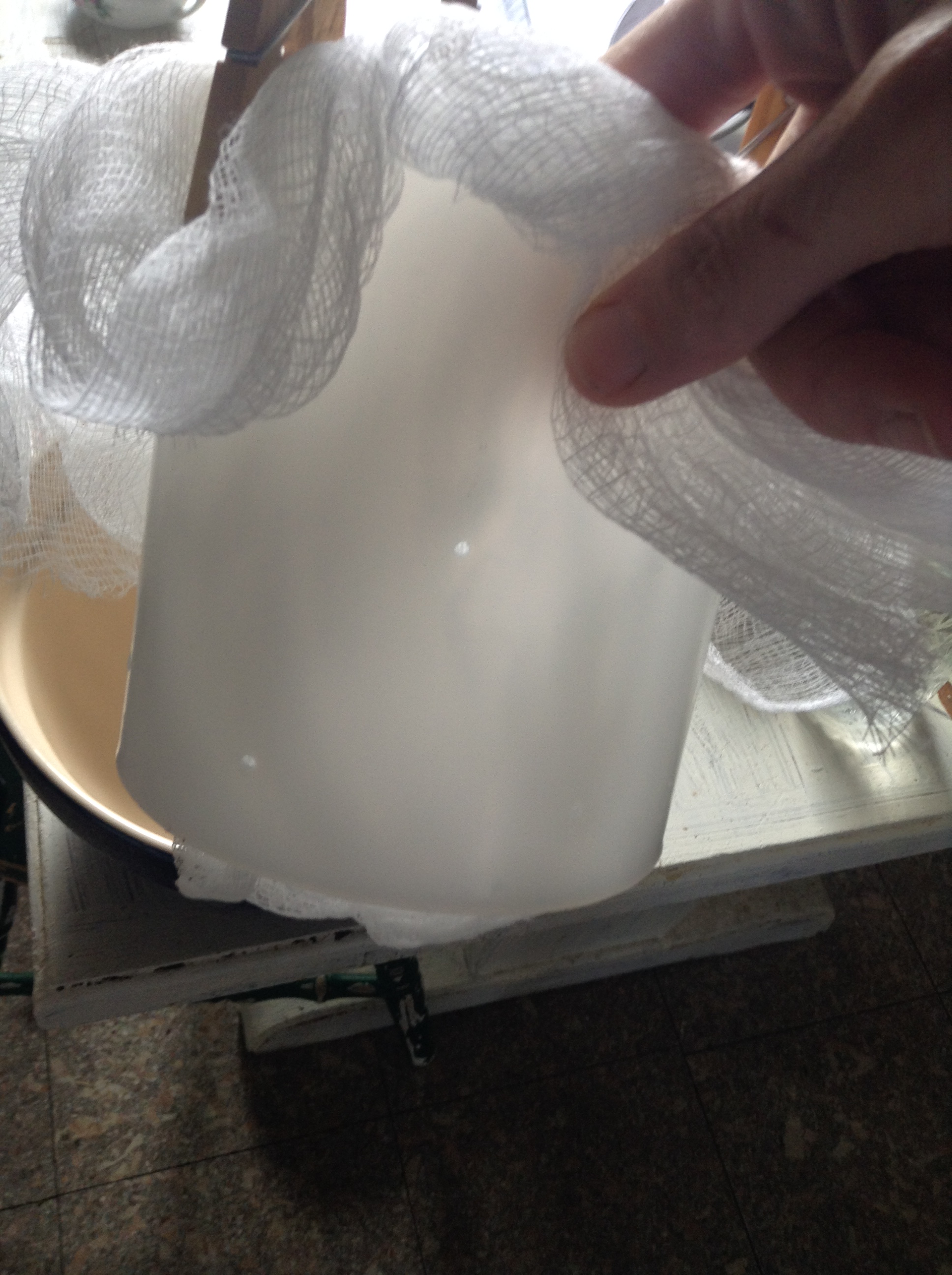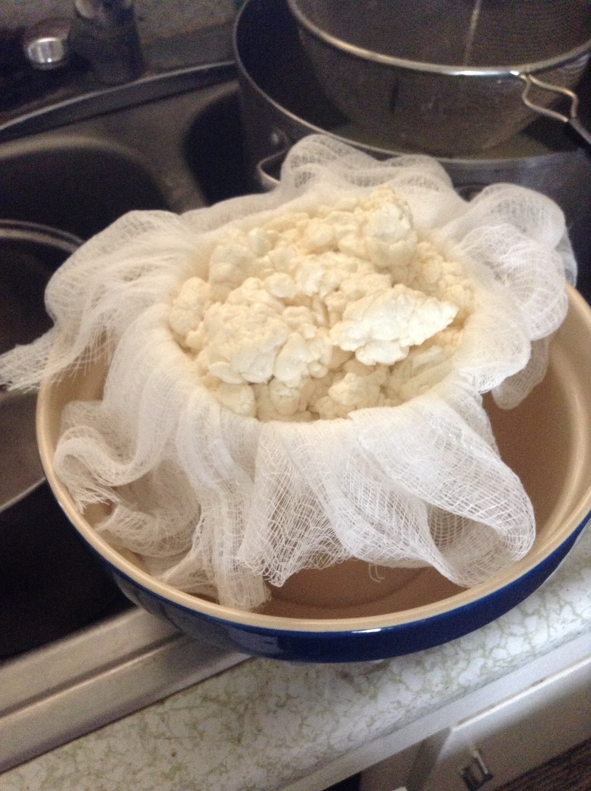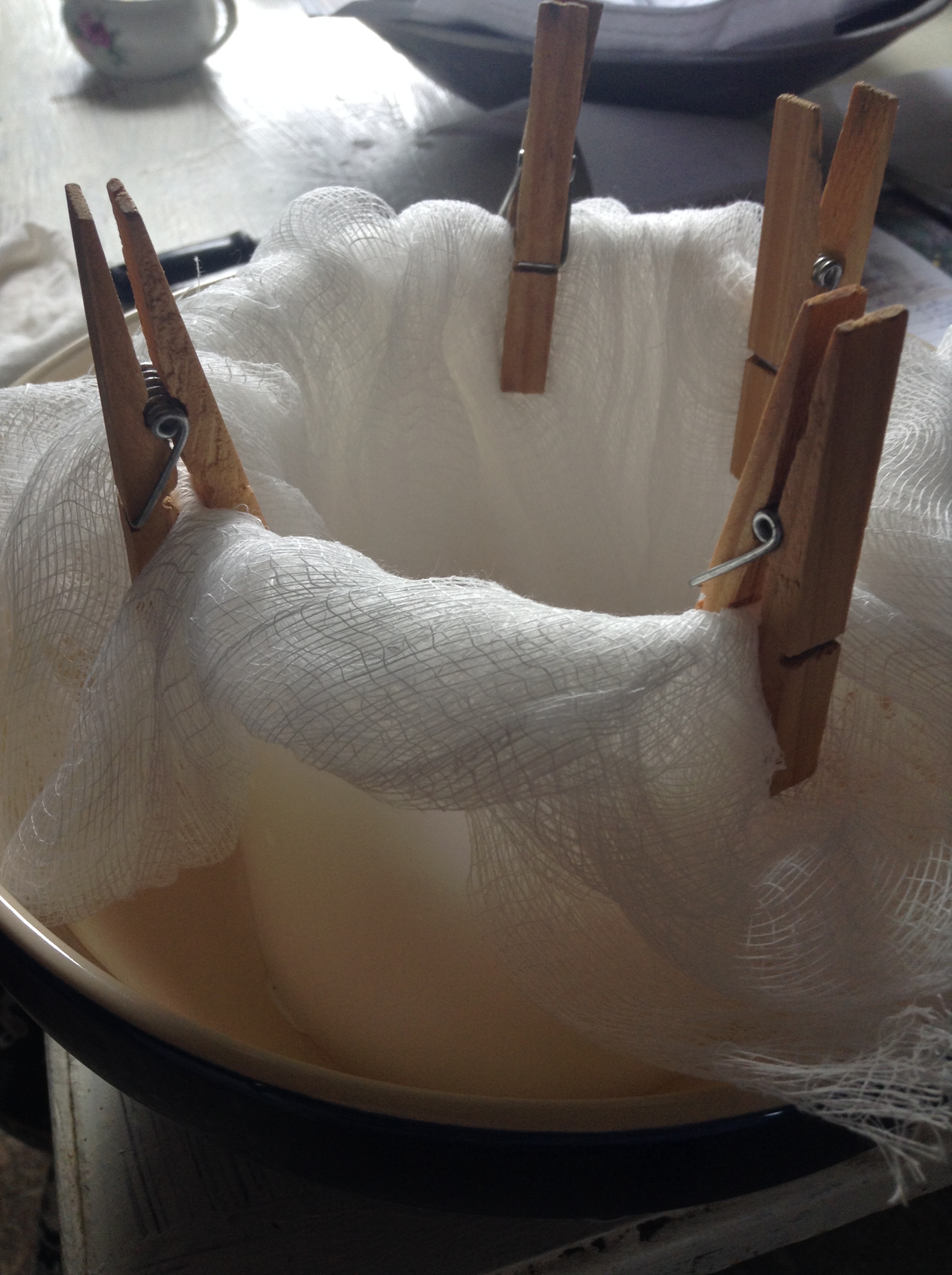 I prepared a mold with cheesecloth and secured it with clothes pins.
