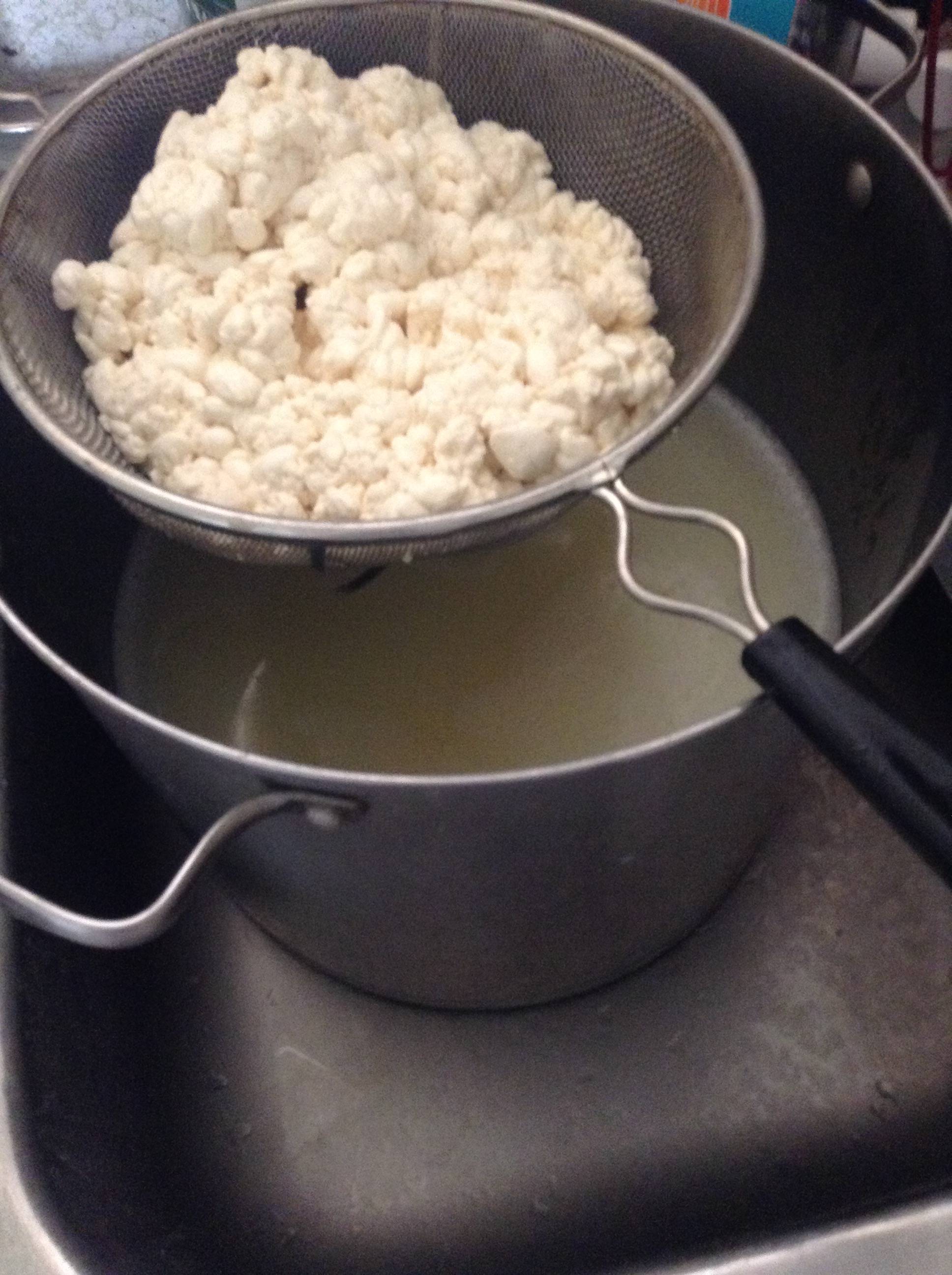 I place a strainer over another pot (to catch the whey) and pour the cheese into the strainer.