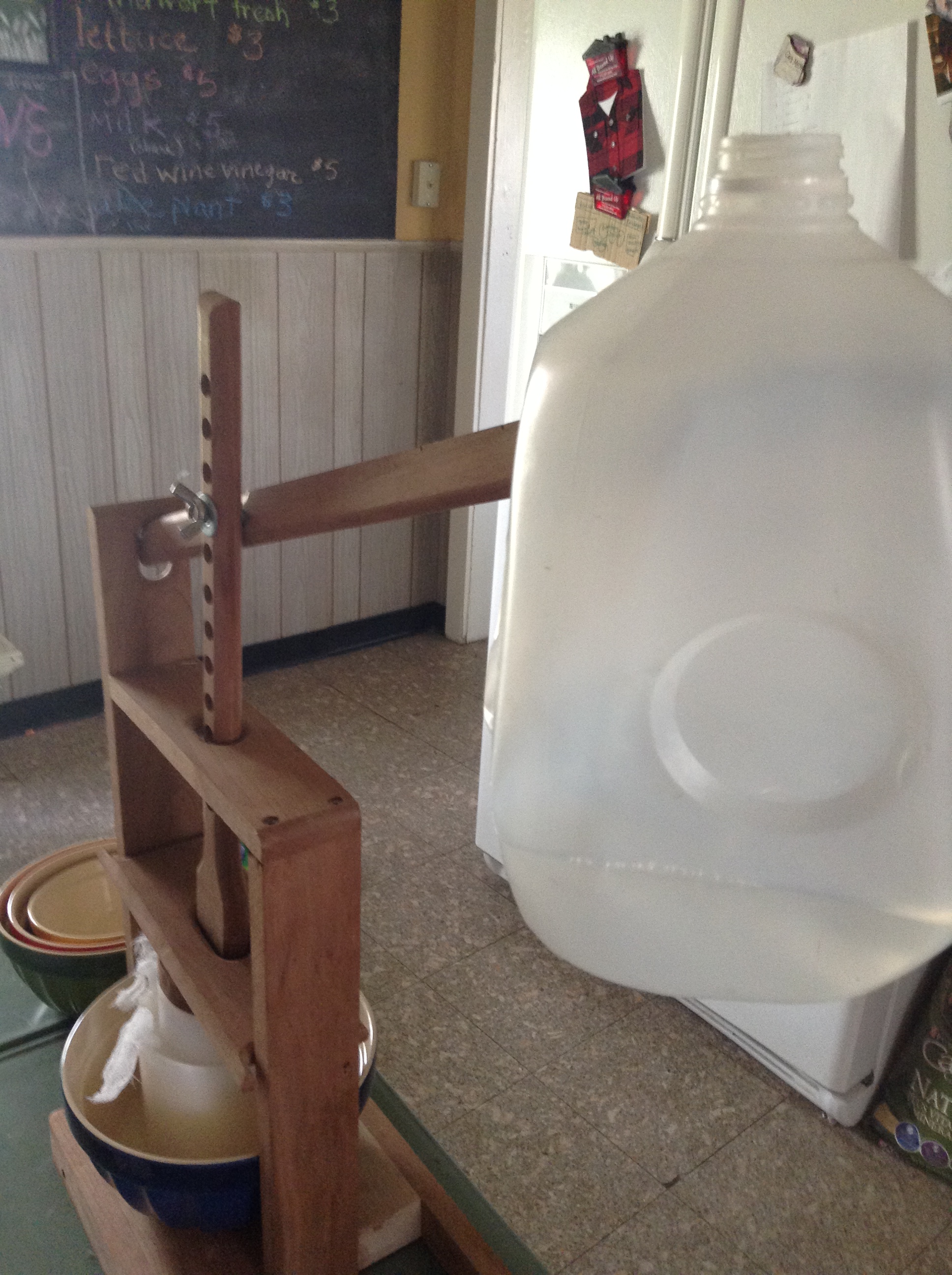 Fold over the top of the cheesecloth and place a 3-4 pound weight on top. If you are using a cheese press this can just be three inches of water in an empty milk carton hanging from the end of the handle. You may as well get a cheese press, this activity is rather addicting! You could use a cantaloupe or something, I suppose, as the weight. The mold just needs to be a cylinder with holes in it.