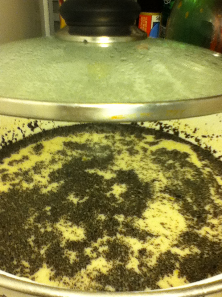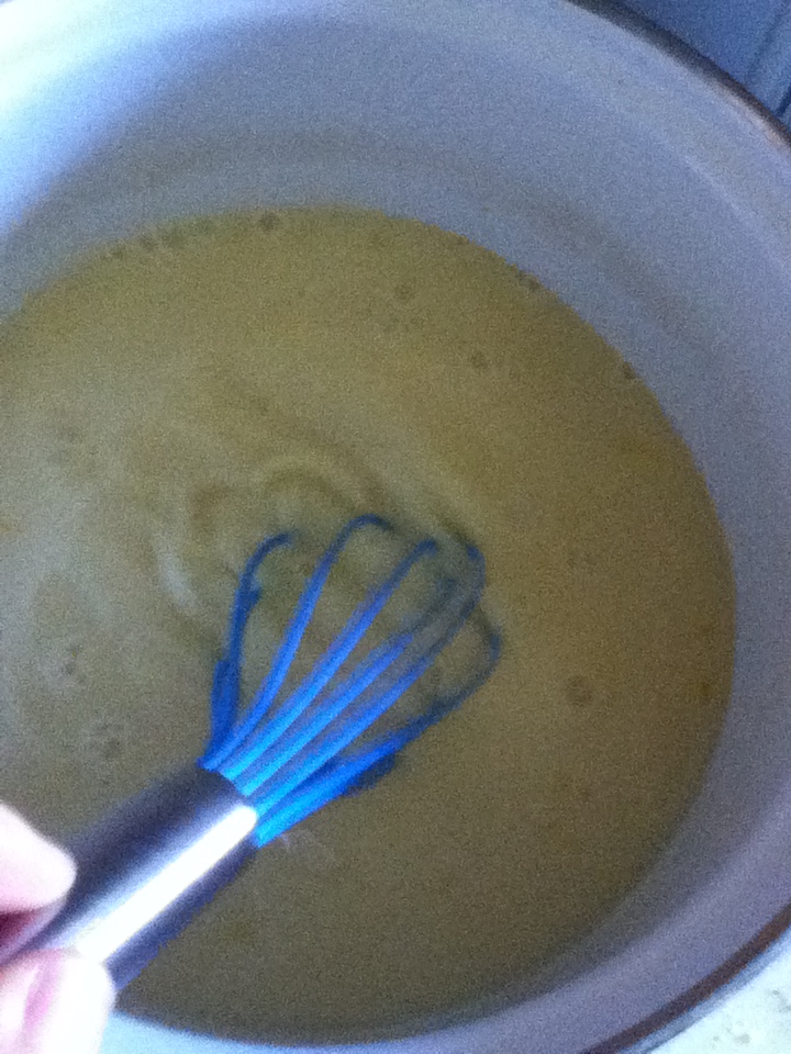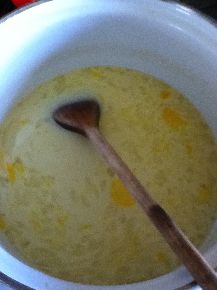 Blend 4 eggs with 1 cup of sugar and 2 cups of goat’s milk together in a sauce pan and heat over medium low whisking the entire time.
