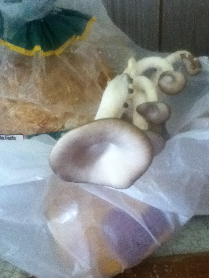 The other day I looked over at the counter and there were oyster mushrooms sticking up! Mind you, I have failed at every mushroom log venture and the like and I sure didn’t expect this one to be any different. I took a mushroom class and it was fascinating watching the inoculated wheat be added the warmed straw and stuffed into a bread bag with promises of culinary treats. Our house is so cold that I doubted that it was warm enough for the mushrooms to fruit. They needed to be kept at 70 degrees for three weeks. I couldn’t find a place over fifty-five degrees anywhere in the house except by the ducklings. Their heat lamp helped raise the temperature just right. A few holes were punched in the bag and after awhile these beauties popped out. Now, one would take this bag after it was done fruiting and plant it. So to speak. Create a simple raised bed and fill with used coffee grounds. Sprinkle the inoculated straw all over it and let nature do the rest.