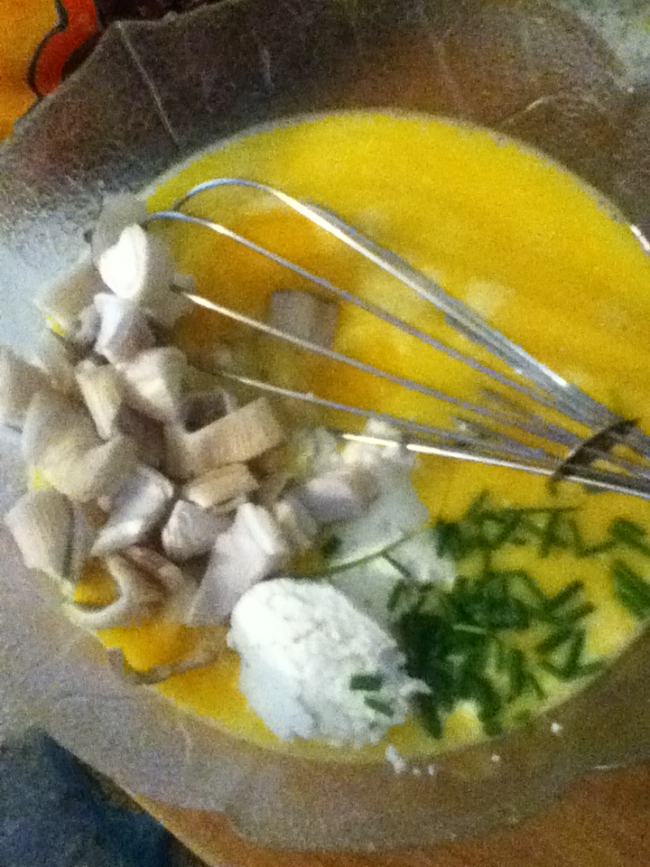 So fresh eggs cracked into the bowl, whisked with creamy milk. Add homemade goat cheese and chives. Add chopped oyster mushrooms from the counter. A bit of salt and pepper and there you have it. Homegrown, homemade, homesteading scrambled eggs. What a blessing to grow a bit of our own food!