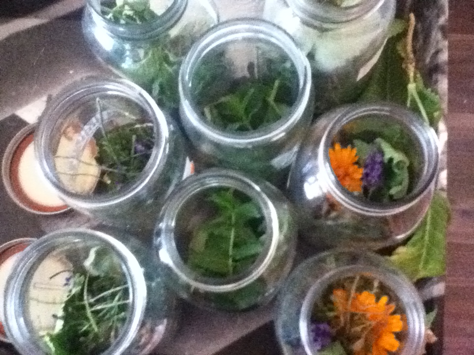 Pour boiling water over herbs. This makes 2 cups. I like to reuse the herbs later that day. A quart a day of this tea is lovely. My friend infused delicious honey with lilacs (one of my favorite flowers) and I use that in my teas.
