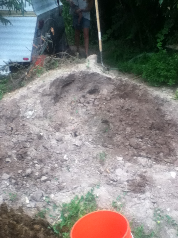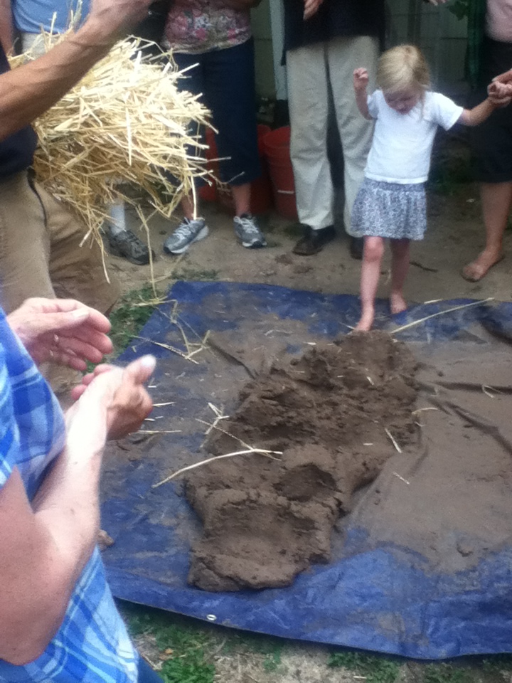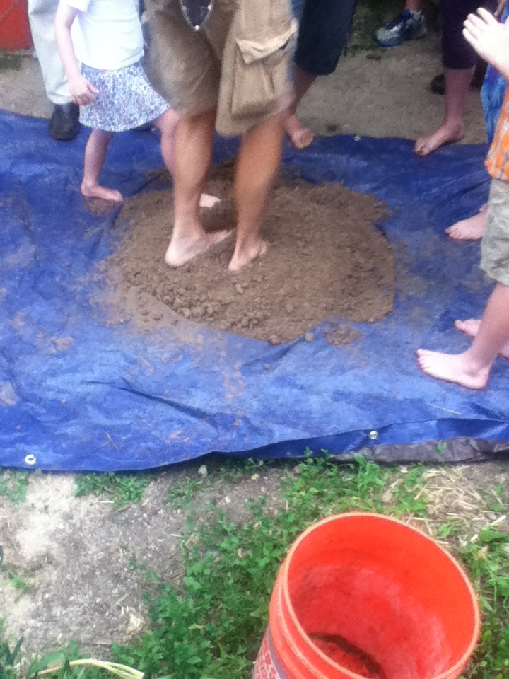 Then the fun began. A well was made in the center of the dirt and water from the hose added to the middle. Then children and adults alike stomped in the mud to create a pudding like consistency.