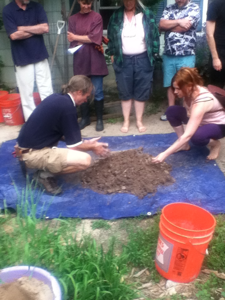 Niko started with a 5 gallon bucket of clay that he sourced from a job site in town where someone was digging out a basement. He added a 5 gallon bucket of sand (purchased and salvaged off of craigslist from the flooding in the area last year).