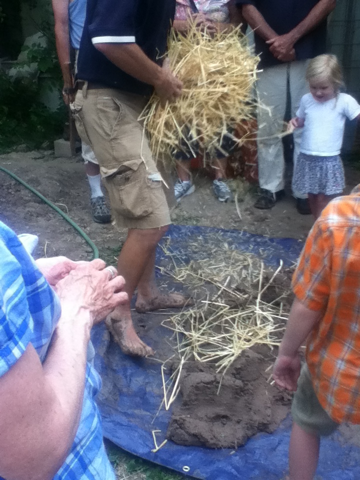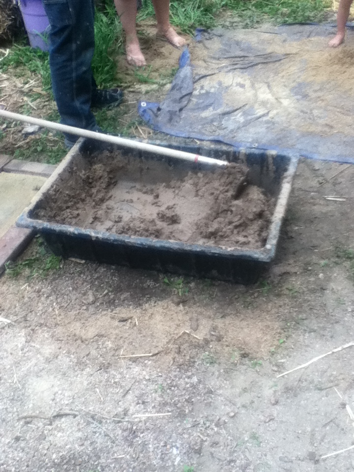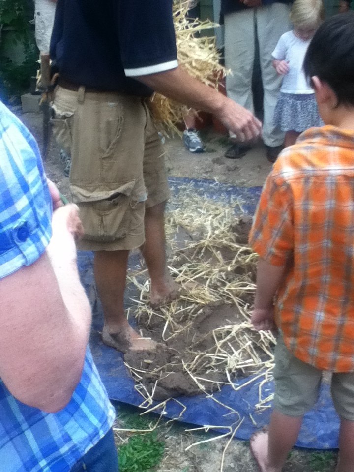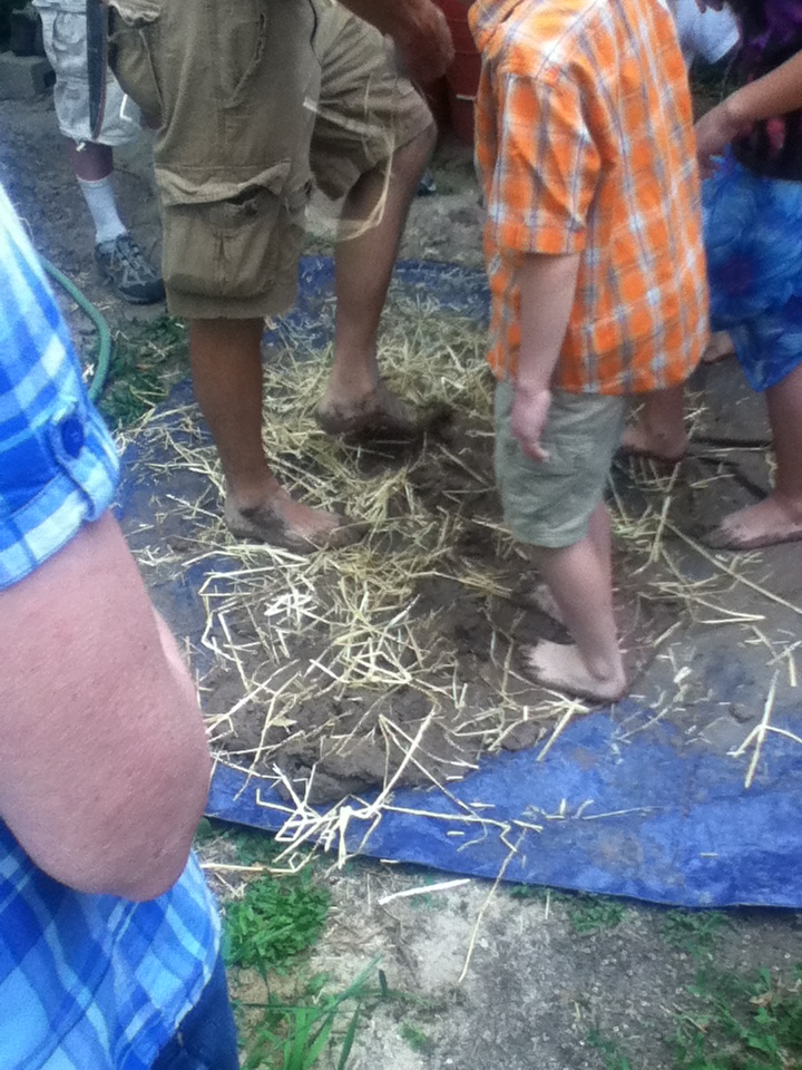 The children had so much fun blending with their feet. The mix is done when straw can be seen in any clump that is taken off but no thick masses of straw. It must be all well combined.