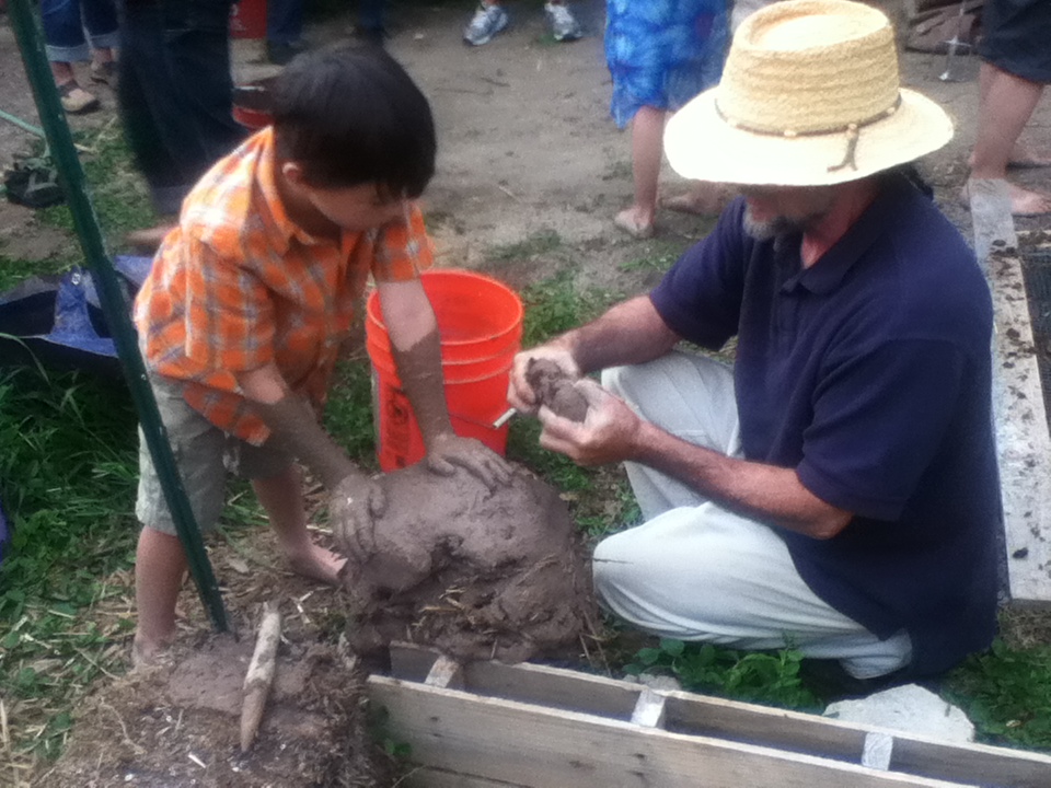 The cob is added over a heavy foundation of large stones and then can be blended over wood outlines and mesh. For an example he used a large stone by the garden. Folks helped to blend balls of clay on top of each other using a slip if necessary to moisten and bits of straw to help blend. A stick can be employed to help blend two masses together. They created a fun little cat goddess. The entire batch only made the cat goddess about a foot and half high. So for large projects a cement mixer or other large piece of machinery may be used.