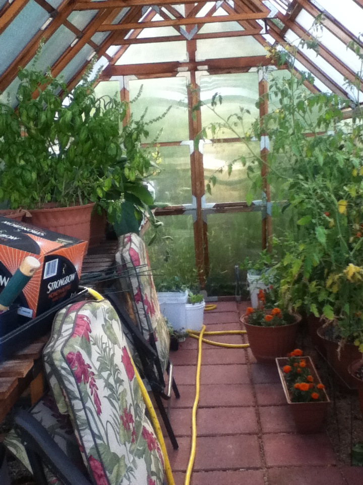 My friends’ greenhouse stands erect and proud in their yard. I am impressed that it hasn’t blown away, been destroyed by hail, or any other natural greenhouse killers on the Plains. It is set to the east of a steep hill which much keep it somewhat protected. It is quite well made and cost them a few thousand dollars three years ago.