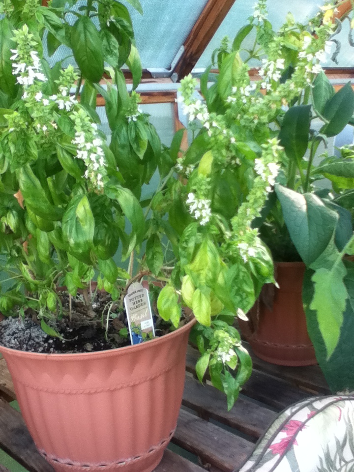 I have been noting the differences in the areas of the greenhouse. The lettuce does best below the shelf on the south side. It gets plenty of light but doesn’t burn up. This would be a good place for cold crops like greens, broccoli, cauliflower, or cabbage when extending the season. I only have to water those plants every four to five days. The plants on the top shelf, herbs, especially huge basil plants and comfrey, sun bathe and grow lavishly. I water them along with the tomatoes every other day.