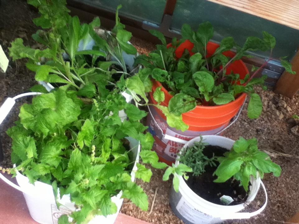 A shelf across the south side offers more space. I brought over my five gallon buckets of kale, chard, spinach, and lettuce, and a few herbs. They absolutely love the greenhouse. There are a few pesky grasshoppers but not as many as there would be in an open garden.