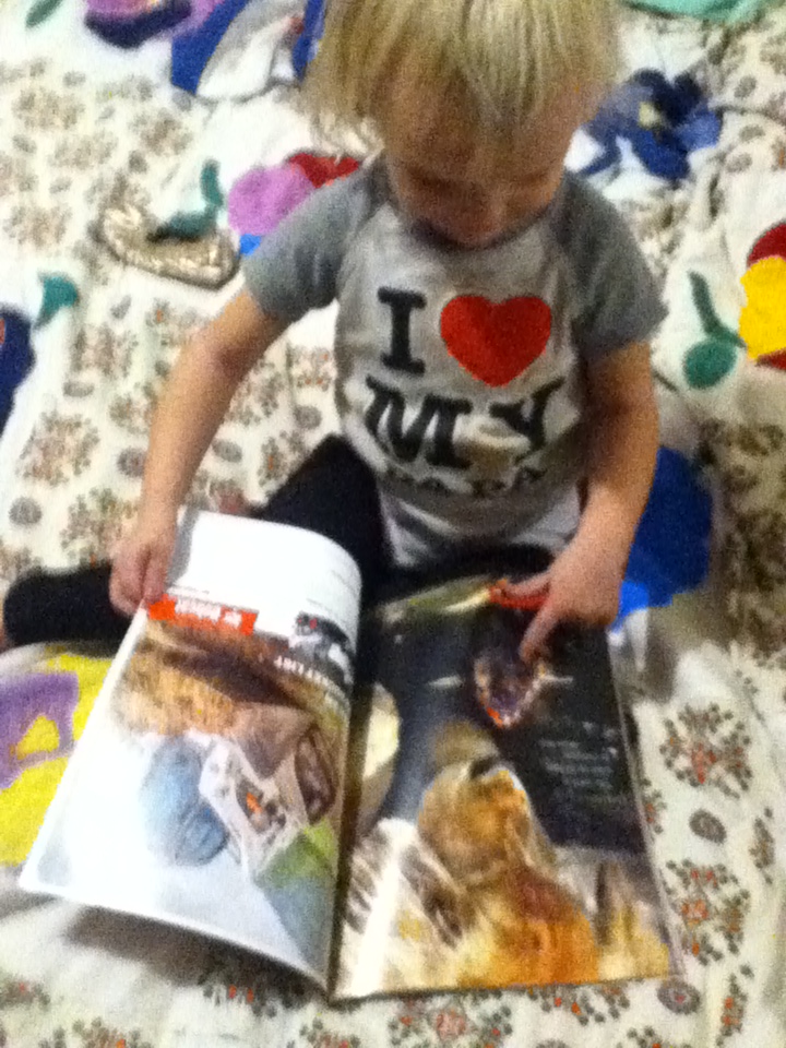 Maryjane’s mama had to work late last night. She was getting to that two year old too tired to stay awake hysteria. So how do you calm a born farmgirl? Hand her a farming magazine.