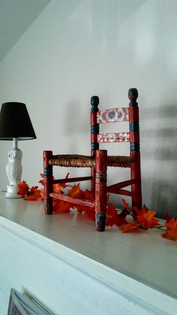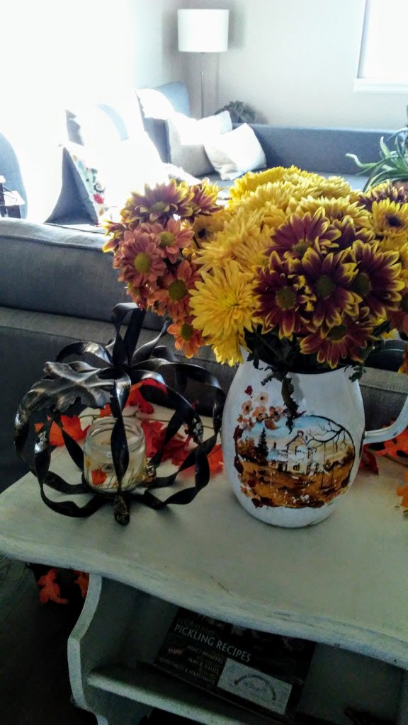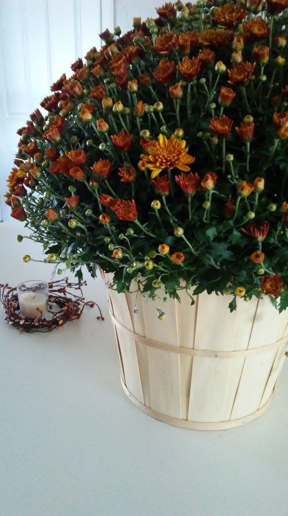 The colors of Autumn trees inspire my color palette most of the year, with rich golds, reds, and bright oranges. Mums and throw pillows add these easily to any room.
