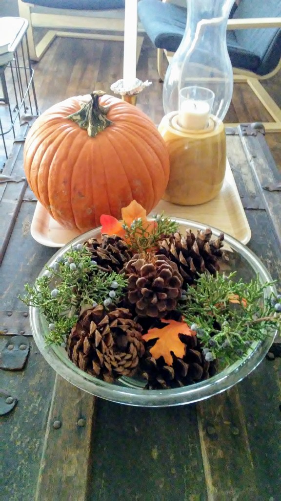 A simple Pyrex bowl of found goodies becomes a charming still life. Here I used pine cones, cedar, and faux leaves. (If you have more deciduous trees than I, feel free to add in real leaves!)