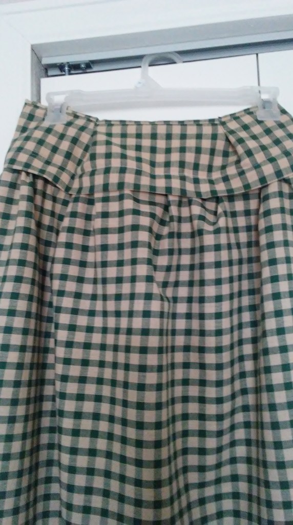 I walked to the library yesterday. I spent the morning designing and sewing a long skirt for myself out of green and beige check. It is tied shut with four lace ribbons and the front has a high waist. I sewed on a lace hem. It looks a blend of Victorian and colonial- my style. It just needs a pinafore.