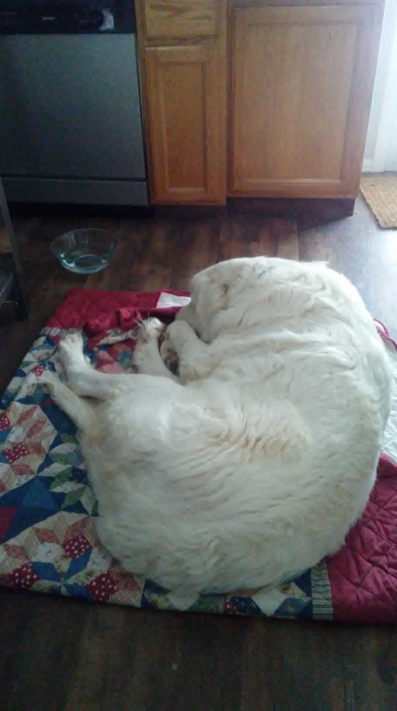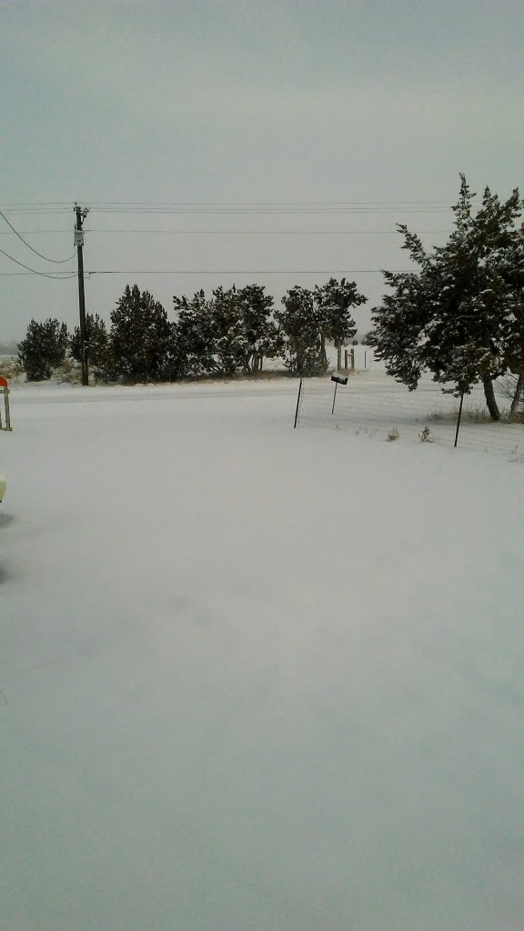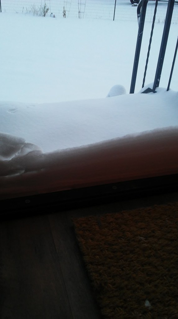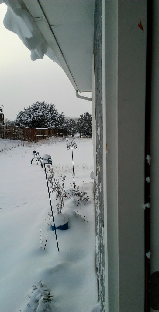 I opened the front door to great heaps of snow. For southern Colorado, this is quite a storm. It is still blustery and the snow is falling thickly with glints of sunlight shining through. It is a chattering 1 degree with the wind. Our farm dog, Gandalf, is sleeping indoors this morning despite his woolly exterior.