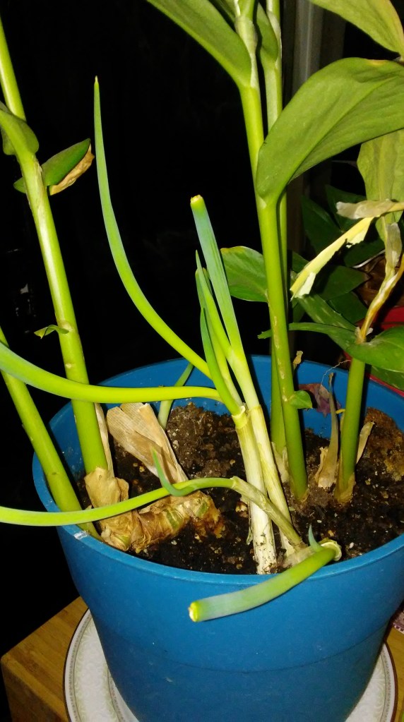 I chopped the fragrant green onions and set them aside. The roots still looked nice so I scooped a little dirt up from the side of one of my plants and stuck the bottoms of the green onion in. Within days they were growing a vibrant green in my Yuletide kitchen. The ginger plant doesn’t seem to mind. It changes the game of winter cooking if you have some fresh onions or chives to sprinkle on.