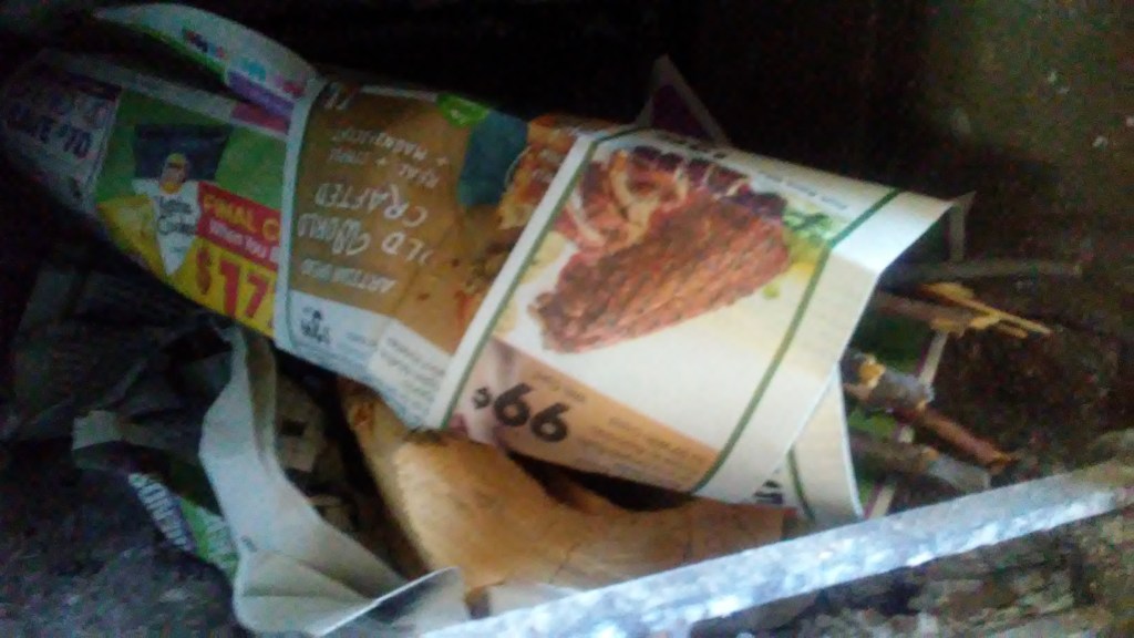- I like to put a small, flat piece of wood down over the grates and place four to six crumbled up newspaper pieces just tucked under and around the wood. Crumple the paper well, if it’s loose, it will burn too quickly.