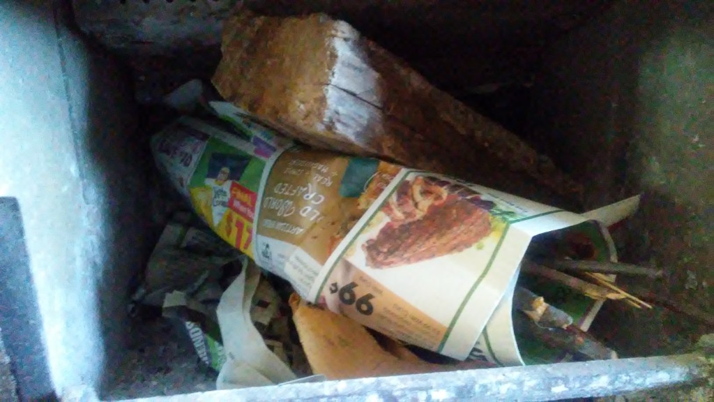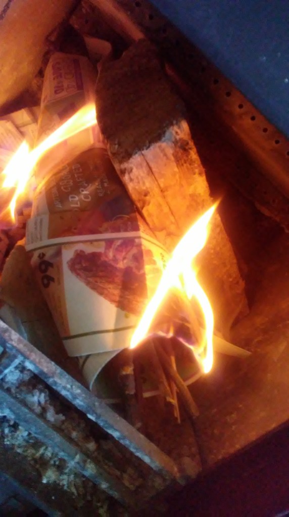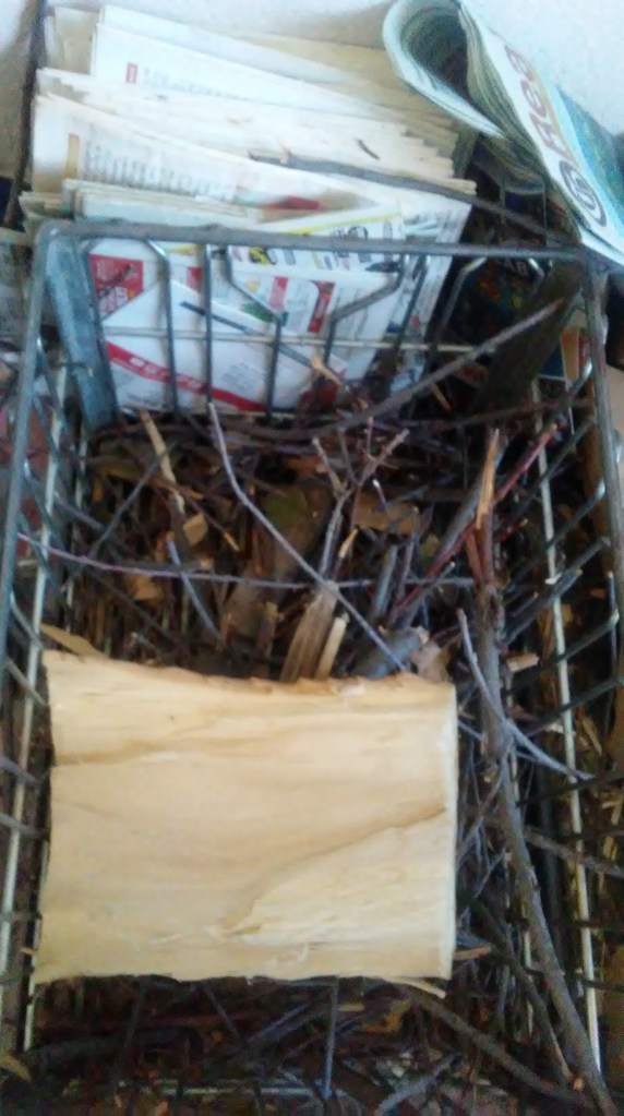 Kindling– My granddaughter’s daddy, Bret’s great-grandpa was busy cutting down trees and chopping wood until the park that he lives in said he needed to get rid of all the wood. My cousins and their truck swung by and picked me up and we were off to Denver to get a truckload of wood. Most of it was piled into boxes and was perfect for kindling. Any small twigs, tiny branches, and pine cones make excellent kindling along with newspaper. I admit I do not read the paper but I always pick up the free ones for the wood stove.