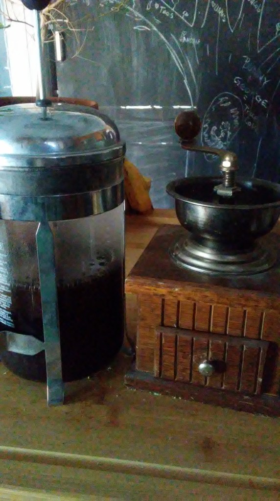 The grinder has a gentle whir that I rather like as I churn the handle around. It isn’t difficult and within minutes the smell of freshly ground coffee awakens my senses. The kettle on the stove starts to bubble and the grounds hiss and extract as the boiling water immerses into the French press.