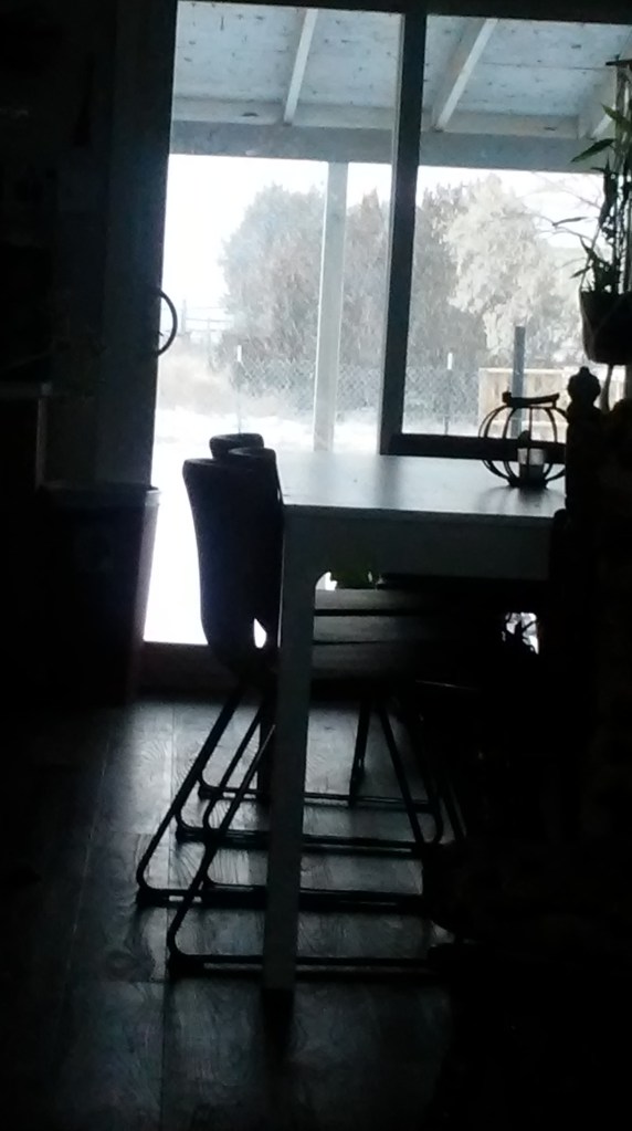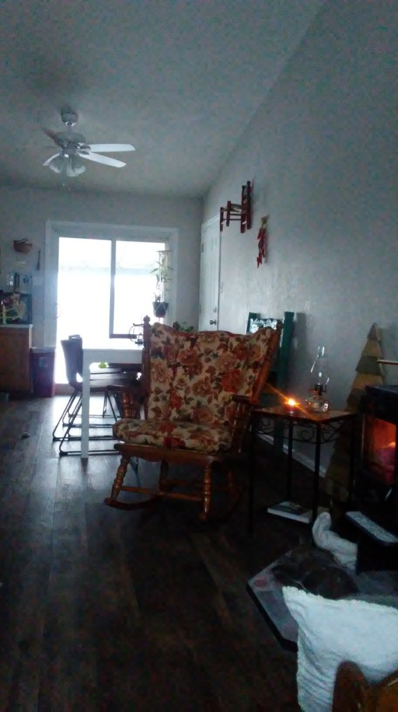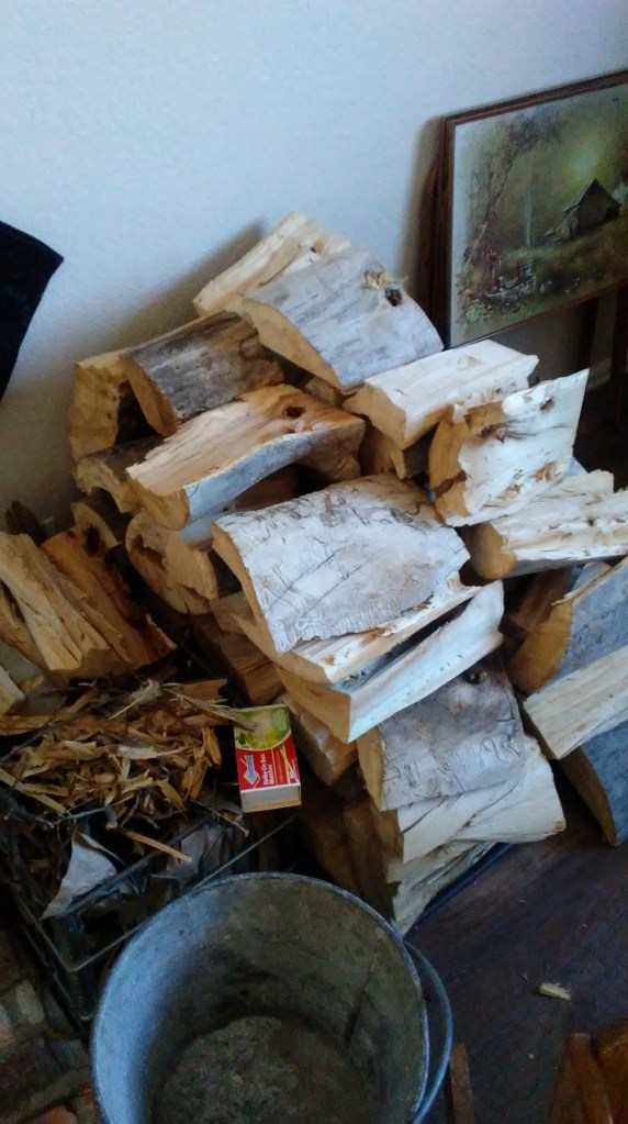 The dawn filters through the windows white and glowing after the night of snow. I put my warm robe on and wander out to the wood stove to start the fire. It starts spreading heat quickly and the kitties gather and curl up on furniture around the stove while I start the coffee.