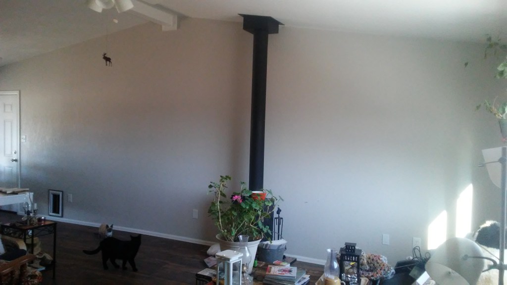 We put up hundreds and hundreds of jars of produce each year and where will we put them? There is no basement here and we have limited storage. We spend most of our time in the main room of our house. When you walk in the front door you are in the living room which is attached to the dining room and is separated from the kitchen by only a 3/4 wall that was made into a pantry. If that wall were gone, it would be a perfect square. The wood stove putters along nicely heating the house and the east and west windows keep the space light, the high ceilings make it feel airy and rustic. To make it fit our needs better, there are two things we wanted to do, build shelves along the north wall and take down the wall.