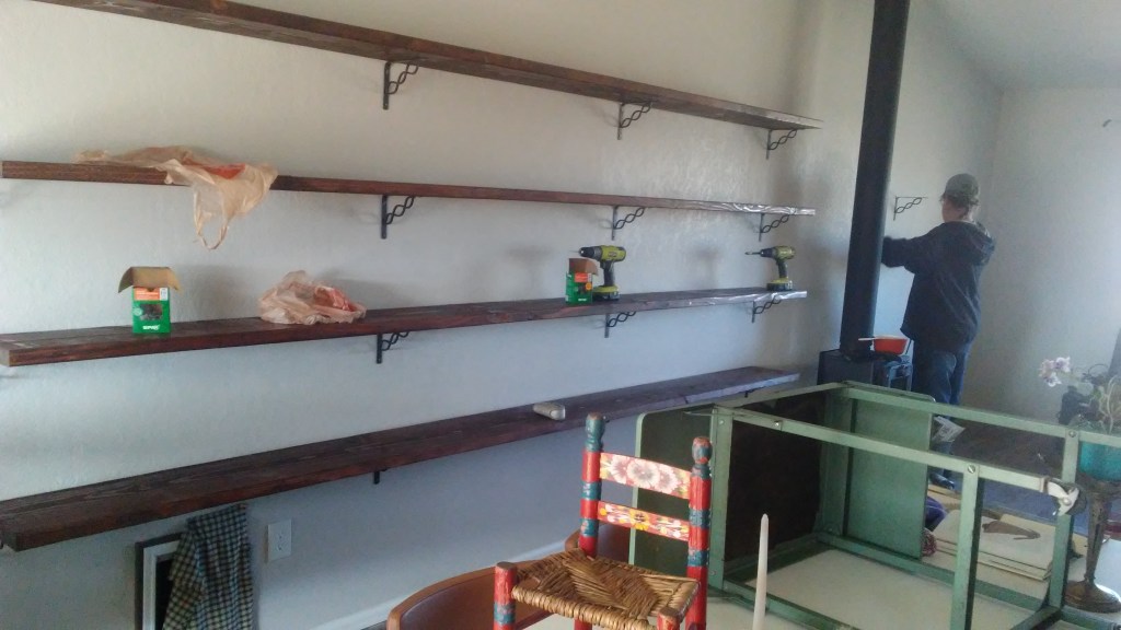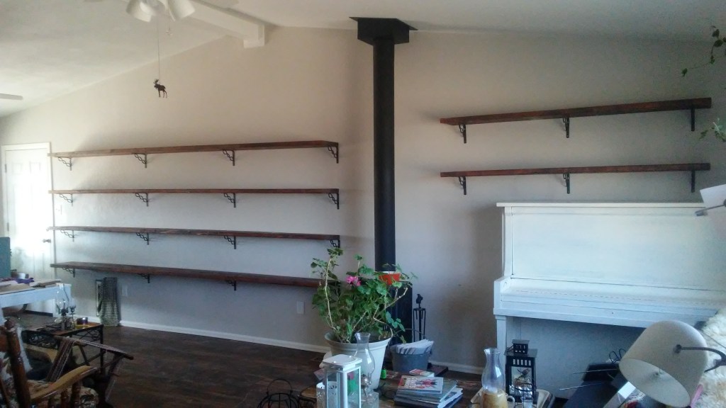 With the rebate we received from getting solar panels on our last house we hired the fellow that put up our shed. The shelves are stunning and rustic. It is rather amazing how shelves can totally transform a space. We chose the brackets (Celtic scroll) and the wood stain. Four 12 foot long shelves went up on one side and two 6″ boards went up on the other side. Kevin was kind enough to move my behemoth piano to where I wanted it. The result is stunning. You could call our decorating style, 1860’s General Store style, I guess!