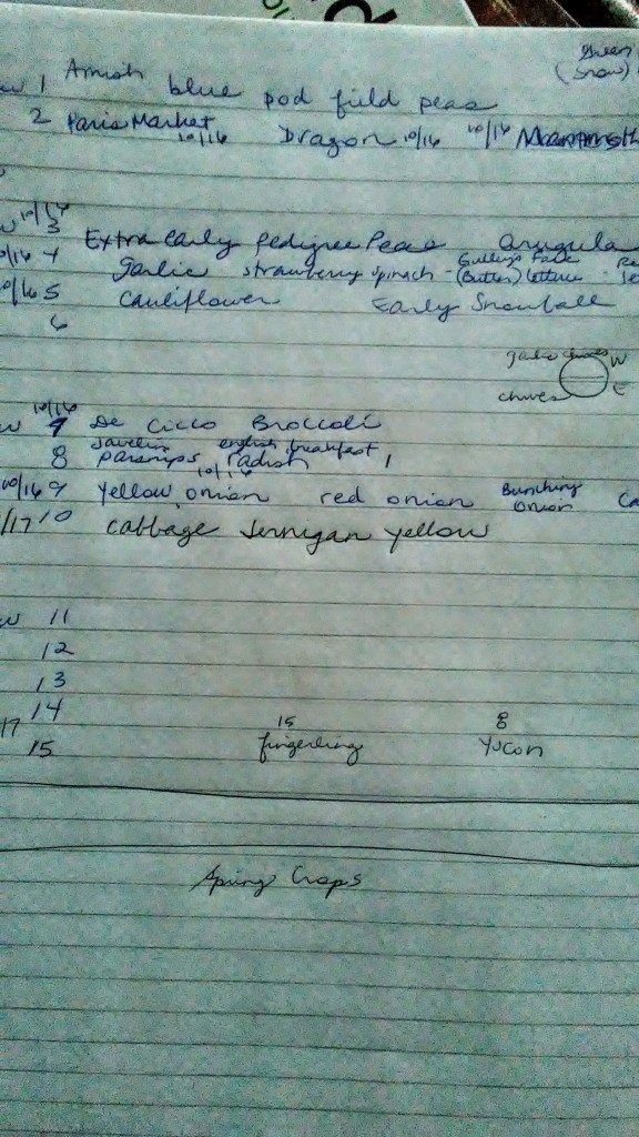I always haphazardly put out plant markers but they end up disappearing, so I keep a ledger of the type of seed and where it is planted and the day I planted it. This helps me keep track of my favorite varieties (5 Silverbeet Swiss Chard!) and what doesn’t work (having a doozy of time trying to get brussel sprouts to grow). I also know what mysterious plant is coming up when the plant marker gets blown away.