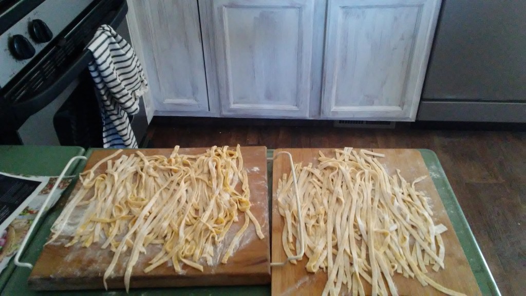 From here you can use a long, wooden rolling pin or a hand cranked pasta machine. If using a rolling pin, roll out as thin as possible, dusting with flour as needed,and use a knife to cut thin strips.