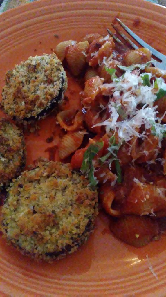 Crispy, delicious eggplant slices on top of spaghetti with a rich tomato sauce. Fried pickles with ranch and a cold beer on a hot summer day. Fried zucchini and mushrooms are another favorite that take me back to Grandma’s house. Swinging my feet at her dining room table waiting for a plate of fried mushrooms, cauliflower, and zucchini.