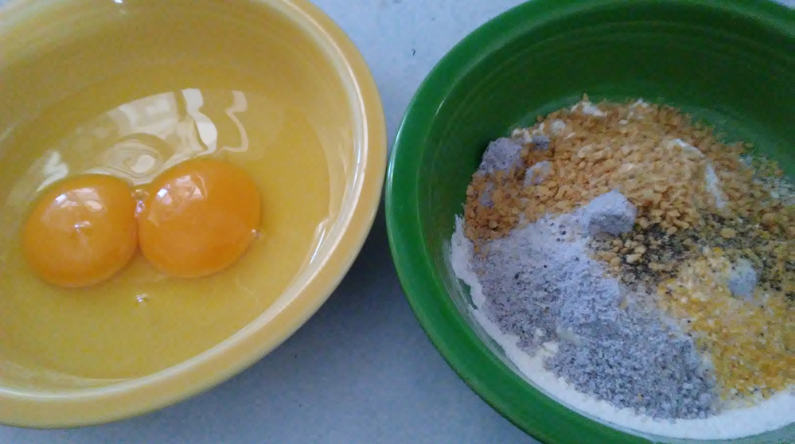 - Pour panko in the last bowl. I sometimes like to mix panko with cornmeal, or if I am out of panko, I mix cornmeal with flour. Add any blend of spices you like into the panko. I add salt, pepper, nutritional yeast, then add Italian spices, Mexican spices, or curry depending on what I am making. Maybe just a little rosemary or thyme, or Parmesan, or just salt and pepper! Cooking is a sensory experience, so just add by feel.