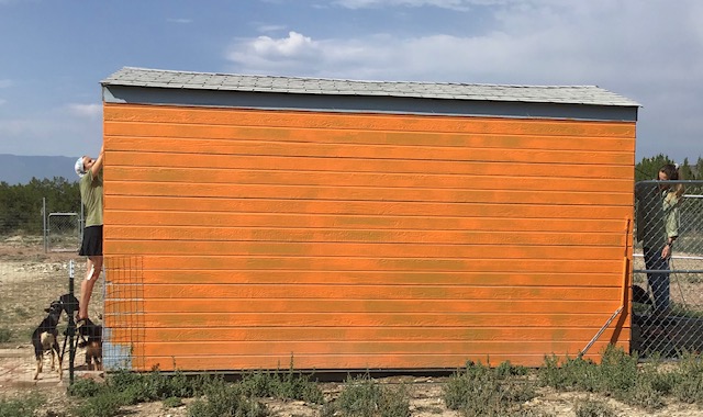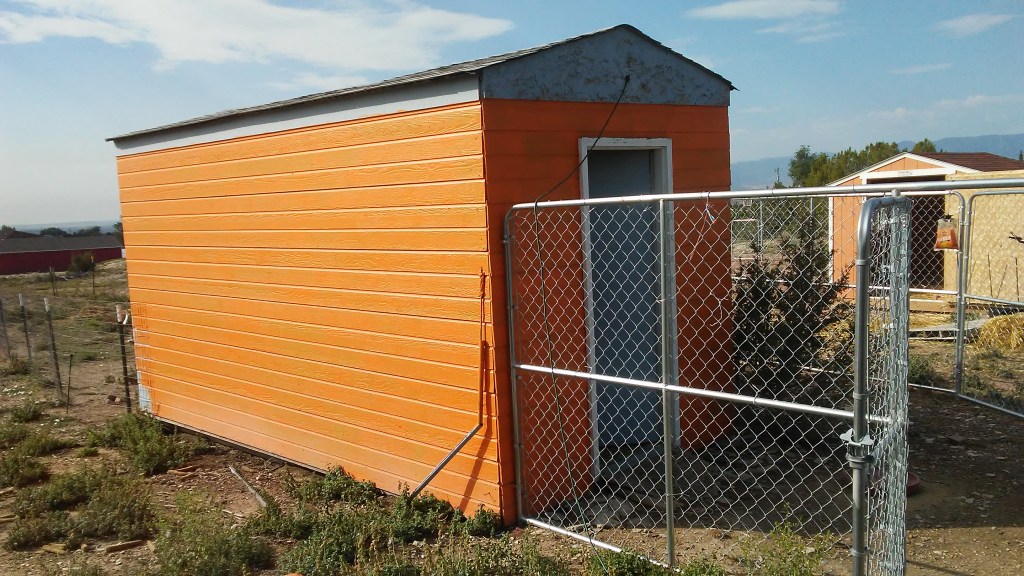 It was painted blue to match the house. That must have been some years ago, because the ply-board and planks had begun to show through the chipped and faded paint. I went out one early spring day and began to paint it orange. It was not the shade I intended and I ran out of paint three sides in, so it has sat, a horrid orange and faded blue exterior with chipped paint gables, for months.
