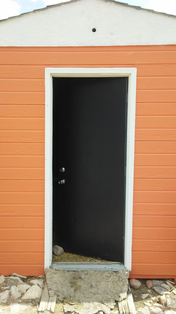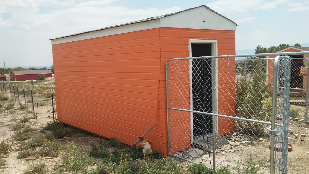 Before we moved here, the chicken coop’s prior life was as a tool shed and workshop. It is 15×10 with a window across from the heavy door. Doug stapled wire fencing over the window to keep predators out and chickens in. No raccoon can open that door in the wee hours of night for chicken snacks. Rafters and shelves allow the chickens to roost. It makes an ideal coop.