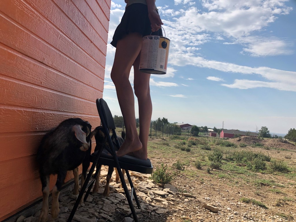 The chickens approve of their new haven. It is easy enough to transform and freshen any building or wall. Just grab a goat or two and a brush. We even freshened up the farm sign while we were at it!
