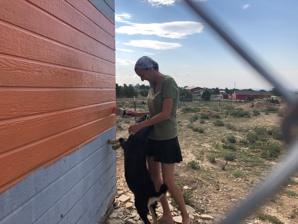 I have the most fabulous wwoofer at the moment. You shall get to know Annie and her lively spirit over the next few weeks. She helped me paint yesterday. The goats assisted, as goats love to do, and we totally transformed the derelict looking coop into a gorgeous outbuilding. The goats are now the same color as the coop.