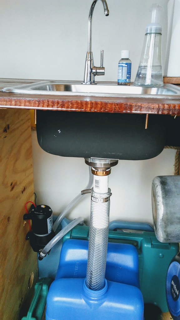 The sink has a pump and containers for grey water and fresh water reserves.