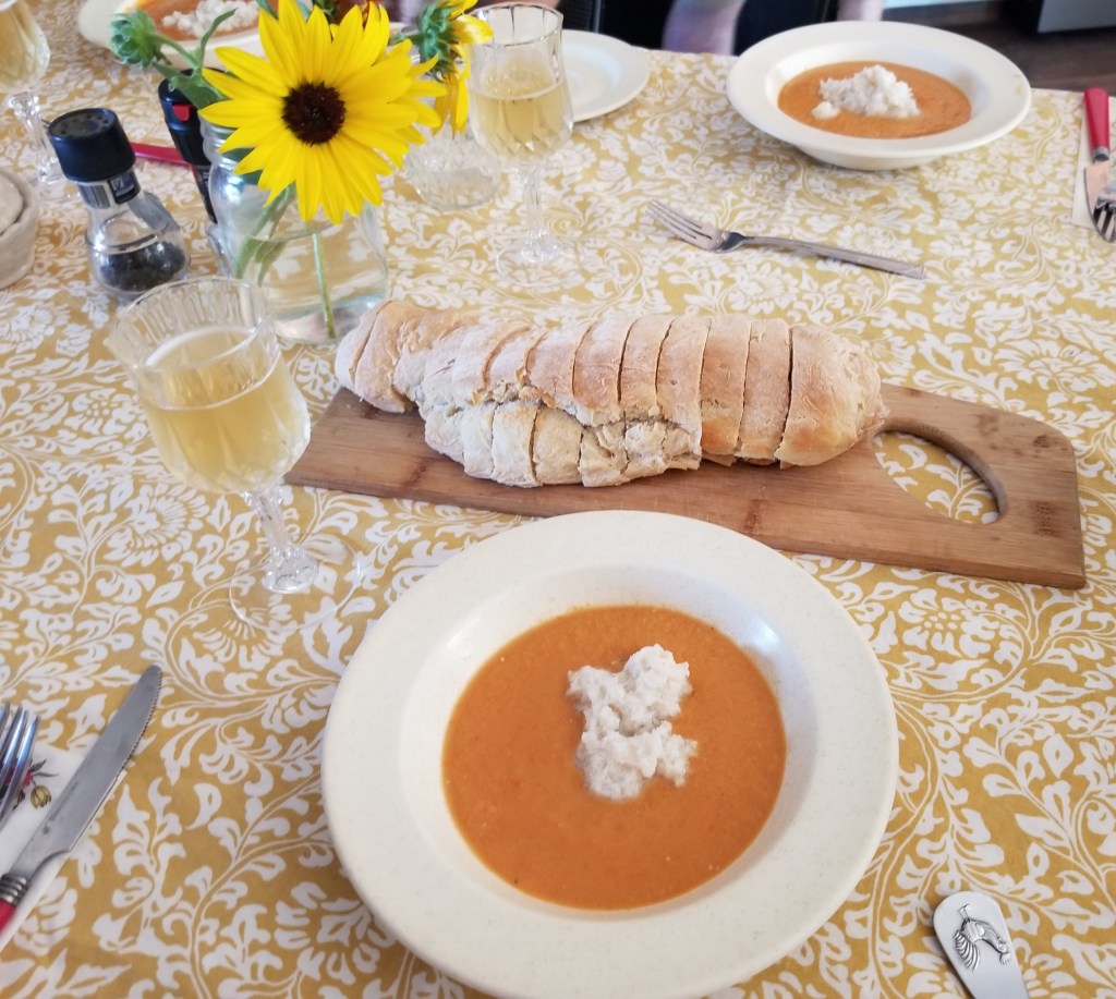 Saturday morning I met up with girlfriends, rested until after lunch, then hit the ground running baking bread and setting the table. The potatoes were parboiled then smashed and placed on a cookie sheet. I poured crushed garlic and olive oil over the whole thing and put it in the toaster oven to start after the soup course.