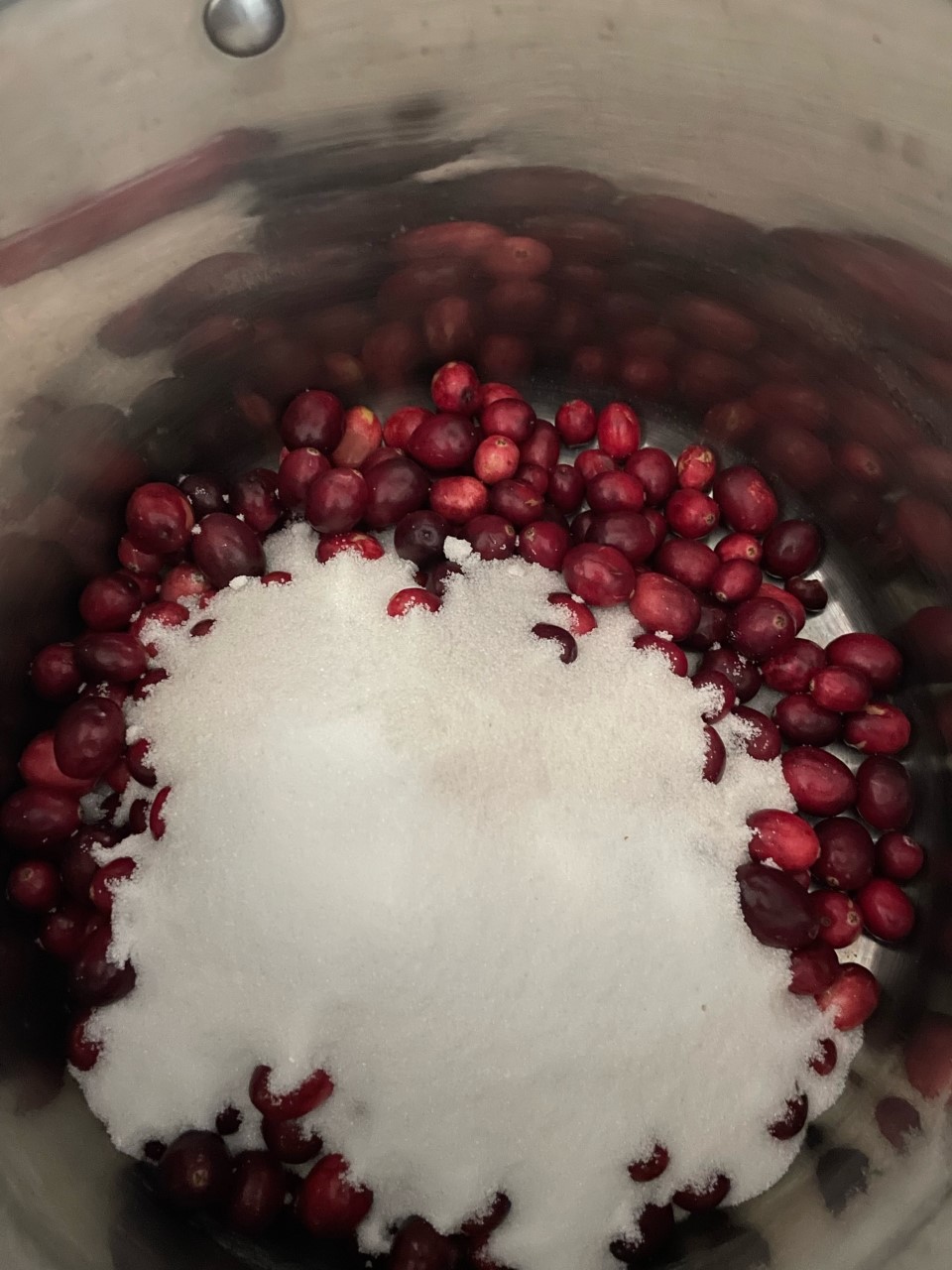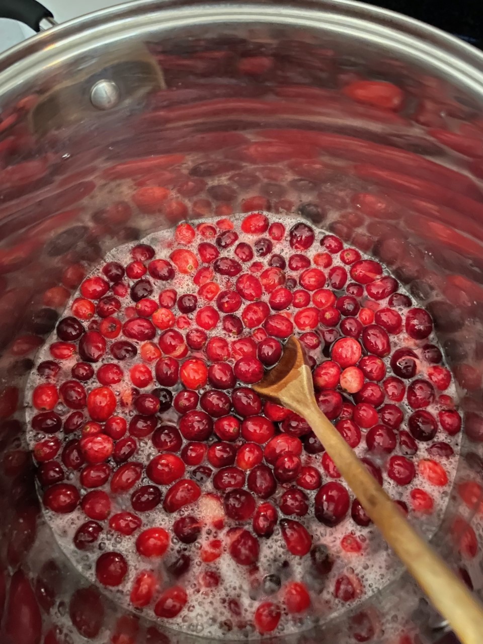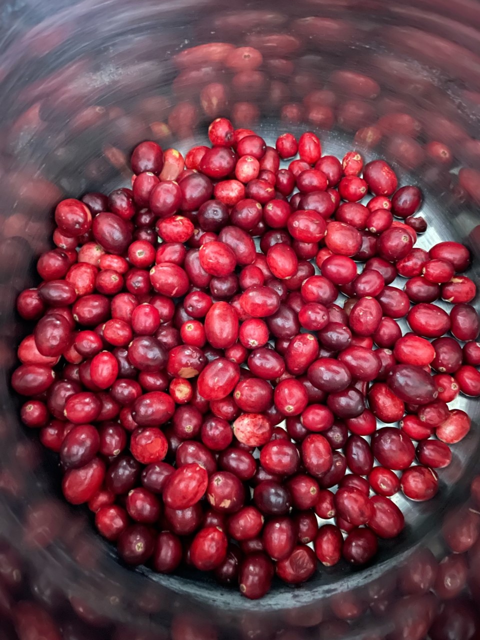 Cranberries are in season fresh this time of year, and we like to take advantage of fresh produce. One could make this with frozen as well, however, in order to have it on hand. Our wall of jarred produce is what we call “fast food” on this homestead.