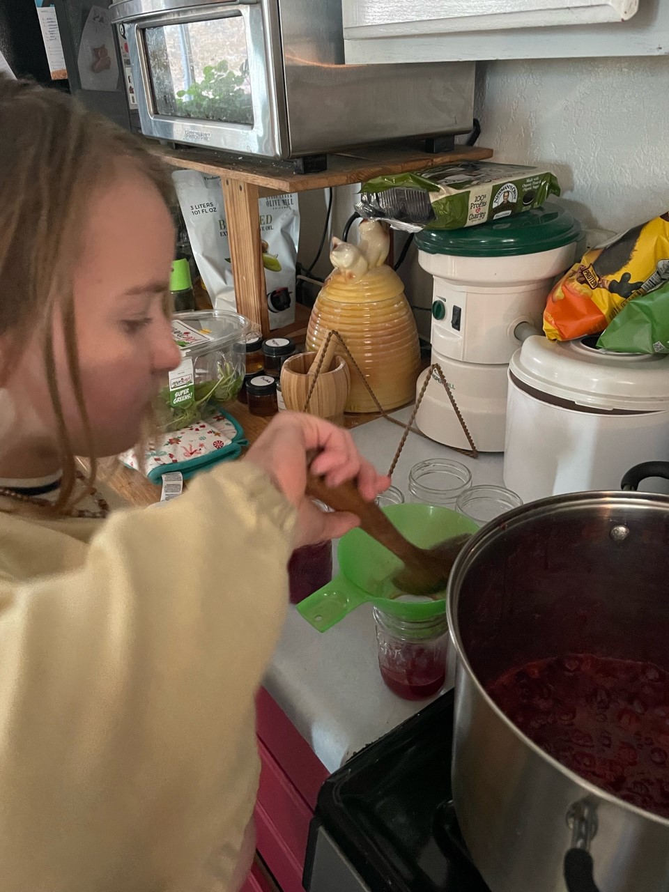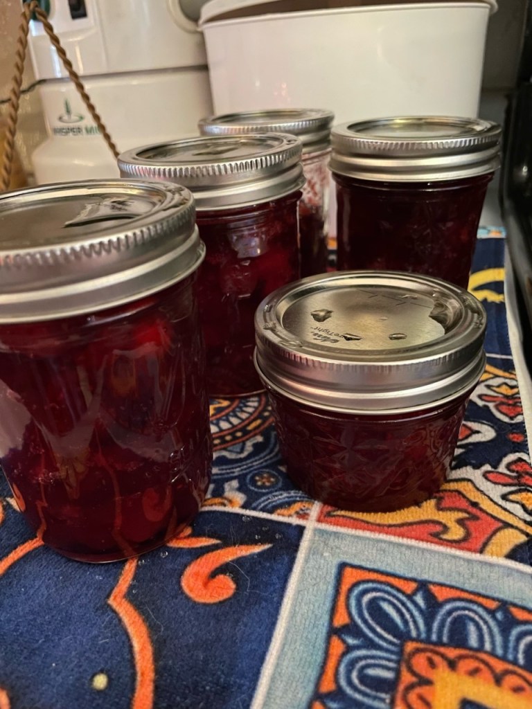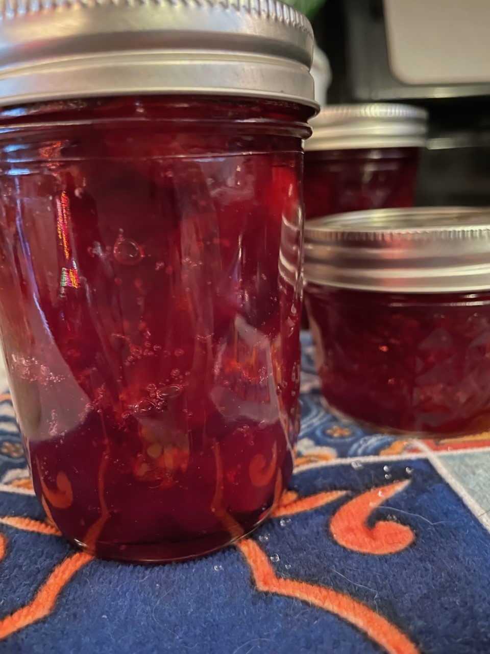 Cranberries are in season fresh this time of year, and we like to take advantage of fresh produce. One could make this with frozen as well, however, in order to have it on hand. Our wall of jarred produce is what we call “fast food” on this homestead.