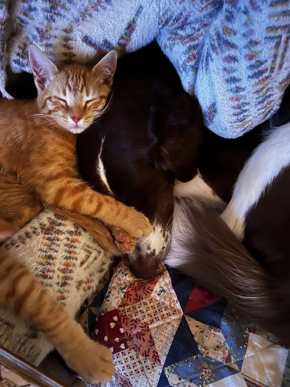 Our farm dog is half Pyrenees, half Border Collie, but has settled on guarding the housecats from the sofa. She is a guard, a lover, a herder, but mostly a couch potato, unlike her predecessor, Gandalf.
